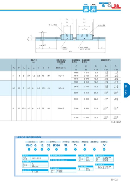 MHDCADLWHDCAD(L4)(L1)L3(L4)(L1)L3L24-M1×深度2-M1×深度d4d3EFMHDCLWHDCL(1)MHD、MHDGLWHD、LWHDGE滑轨尺寸mmhH4附带的滑轨(2)安装用螺栓mmH3WH4d3d4hEF螺钉的公称×R3862.44.22.31020M2×83.51073.563.512.525M3×8基本额定动负荷(3)基本额定静负荷(3)额定静力矩(3)CN10501510191019202640C0N12702120297023503700T0N·m5.38.812.312.219.23280505026.24560530032.8TXN·m2.215.55.532.010.455.45.837.113.373.823.812319.4117TYN·m1.813.04.726.98.846.44.831.211.161.920.010316.398.551210.53.564.52040M3×126260833051.644.723737.519977801140070.480.439967.53351N≈0.102kgf成套产品公称型号的排列例形式标记MHD1G2尺寸123部件标记材料标记预压标记等级标记互换性标记辅助标记C2R32045SL6T17P8/V109形式1MHDLWHD滑块长度2C无标记G3大小尺寸方块型上侧安装短标准高刚性加长8、10、1245滑块的个数(2个)滑轨的长度(320mm)6材料种类无标记SL碳素钢制不锈钢制预压量的大小7T0无标记T1间隙标准轻预压8HP精度等级高级精密级9自由组合无标记S1S2非互换性规格S1规格S2规格10特别配置A、D、E、F、Ⅰ、LR、MAMN、N、Q、U、W、YⅡ-122