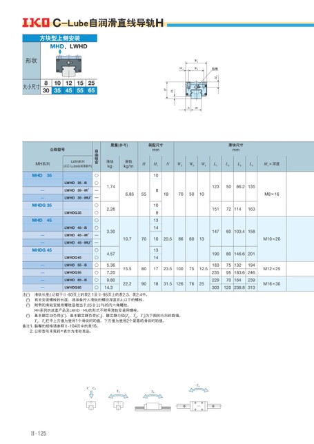 CC0TXT0TY脂嘴H3W2W3W4NWH1H质量(参考)装配尺寸mm滑块尺寸mm滑块kg滑轨kg/mH6.85551.742.263.304.575.367.209.8014.3H11081081314NW2W3W4L1L2L3L4M1×深度18705010M8×161235086.21351517211416314760103.415810.7701020.5866013M10×20131415.5801723.51007512.522.2901831.5126762519080146.6201183235229303759570132194183.6246164239120238.8313M12×25M16×30方块型上侧安装MHD、LWHD形状大小尺寸8301035124515552565自由组合○○——○○○○——○○○○○○公称型号MH系列MHD35——MHDG35MHD45——MHDG45————LWH系列(无C-Lube自润滑部件)LWHD35…BLWHD35…M*LWHD35…MU*LWHDG35LWHD45…BLWHD45…M*LWHD45…MU*LWHDG45LWHD55…BLWHDG55LWHD65…BLWHDG65C-Lube自润滑直线导轨H滑轨长度L记载于Ⅱ-93页上的表2.1及Ⅱ-95页上的表2.3、表2.4中。有关安装螺栓的长度,请准备拧入滑轨的螺纹深度在h1以下的螺栓。附带的滑轨安装用螺栓是相当于JISB1176的内六角螺栓。MH系列的成套产品及LWHD…MU的形式不附带滑轨安装用螺栓。注(1)(2)(3)(4)基本额定动负荷(C)、基本额定静负荷(C0)、额定静力矩(T0、TX、TY)为下图的方向的数值。TX、TY栏中上方值为使用1个滑块时的值,下方值为使用2个紧靠的滑块时的值。备注1.脂嘴的规格请参照Ⅱ-104页中的表16。2.公称型号末尾的*表示为准标准品。Ⅱ-125