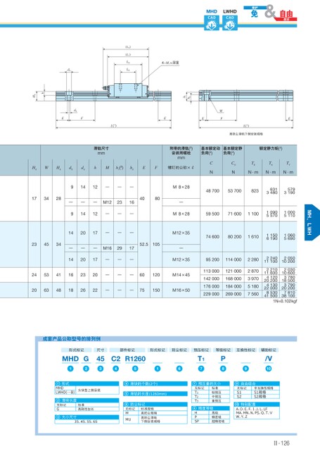 EL(1)高防尘滑轨下侧安装规格EEMFh2h1MHDCADLWHDCAD(L4)(L1)L3L24-M1×深度L(1)滑轨尺寸mmd4d3EFhH4H3WH4d3d4hMh1(2)h2EF螺钉的公称×R附带的滑轨(3)安装用螺栓mm基本额定动负荷(4)基本额定静负荷(4)额定静力矩(4)CNC0NT0TXTYN·mN·mN·m91412———M8×28487005370082363134805793190173428———M1223164080—91412———M8×28595007160011001090557010005110142017———M12×35746008020016101150619010605690234534———M16291752.5105—142017———M12×35952001140002280245341162320———60120M14×45206348182622———75150M16×5011300012100014200016800017600018400022900026900028703970518075602240111002050102002210116004120202004130220008530415002030106003780185003790202007810381001N≈0.102kgf成套产品公称型号的排列例形式标记MHD1G2尺寸453部件标记形式标记防尘标记预压标记等级标记互换性标记辅助标记C2R12604516T17P8/V1091形式MHDLWHD(⋯B)方块型上侧安装2滑块长度无标记G标准高刚性加长3大小尺寸35、45、55、65滑块的个数(2个)7预压量的大小9自由组合456滑轨的长度(1260mm)防尘标记无标记T1T2T3标准轻预压中预压重预压无标记MMU标准规格高防尘规格高防尘滑轨下侧安装规格精度等级8HPSP高级精密级超精密级无标记S1S2非互换性规格S1规格S2规格特别配置10A、D、E、F、Ⅰ、J、L、LFMA、MN、N、PS、Q、T、VW、Y、ZⅡ-126