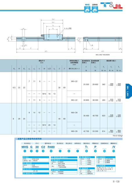 EL(1)高防尘滑轨下侧安装规格EEMFh2h1MHSCADLWHSCAD(L4)(L1)L3L24-M1×深度L(1)滑轨尺寸mmd4d3EFhH4H3WH4d3d4hMh1(2)h2EF螺钉的公称×R附带的滑轨(3)安装用螺栓mm基本额定动负荷(4)基本额定静负荷(4)额定静力矩(4)CNC0NT0TXTYN·mN·mN·m7119———M6×222520028800362309169030916906.523223060———M101813—7119———M6×2230800383004835332740533274091412———M8×28354004070062353628205362820828254080———M122013—91412———M8×284270053200814894446089444601N≈0.102kgf成套产品公称型号的排列例形式标记MHS1G2尺寸3031形式MHSLWHS(⋯B)2滑块长度紧凑方块型上侧安装无标记G标准高刚性加长34大小尺寸25、30滑块的个数(2个)部件标记形式标记防尘标记材料标记预压标记等级标记互换性标记辅助标记C2R48045167T18P9/V1110滑轨的长度(480mm)8预压量的大小10自由组合56防尘标记无标记MMU标准规格高防尘规格高防尘滑轨下侧安装规格7材料种类无标记SL碳素钢制不锈钢制无标记T1T2T3标准轻预压中预压重预压精度等级9HPSP高级精密级超精密级无标记S1S2非互换性规格S1规格S2规格11特别配置A、BS、D、E、F、Ⅰ、J、L、LFMA、MN、N、PS、Q、RE、TUR、V、W、Y、ZⅡ-130