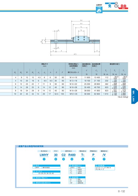 LWHYCAD(L4)(L1)L3L2d4d3EFEL(1)hH4滑轨尺寸mmH54468810H691012141822W152023283445H4151822252834d34.5d48h66799149.58.5111414209121217E3030304040F606060808052.5105螺钉的公称×RM4×16M5×18M6×22M8×28M8×28M12×35附带的滑轨(2)安装用螺栓mm基本额定动负荷(3)基本额定静负荷(3)额定静力矩(3)CN116001810025200354003800058300C0N134002110028800407004190062600T0N·m1122323626238231610TXTYN·mN·m95.655619510903091690536282063134801150619095.65561951090309169053628205793190106056901N≈0.102kgf成套产品公称型号的排列例形式标记LWHY1尺寸302部件标记预压标记等级标记辅助标记C2R48034T15P6/V71形式LWHY横向安装型2大小尺寸15、20、25、30、35、4534滑块的个数(2个)滑轨的长度(480mm)5预压量的大小无标记T1T2T3标准轻预压中预压重预压特别配置7A、E、F、Ⅰ、L、LF、MA、NPS、RE、Y、Z精度等级6HPSP高级精密级超精密级Ⅱ-132