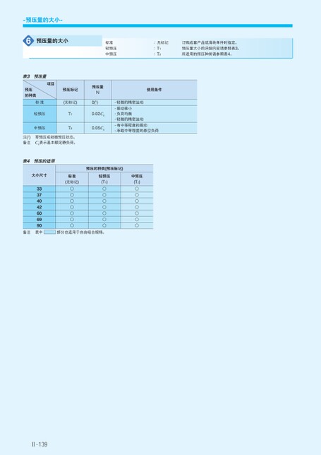 -预压量的大小-6预压量的大小标准轻预压中预压:无标记:T1:T2订购成套产品或滑块单件时指定。预压量大小的详细内容请参照表3。所适用的预压种类请参照表4。表3预压量预压的种类标准轻预压中预压项目预压标记预压量N(无标记)0(1)T1T20.02C00.05C0注(1)备注零预压或轻微预压状态。C0表示基本额定静负荷。使用条件·轻微的精密运动·振动极小·负荷均衡·轻微的精密运动·有中等程度的振动·承载中等程度的悬空负荷表4预压的适用大小尺寸预压的种类(预压标记)标准(无标记)轻预压(T1)中预压(T2)33374042606990○○○○○○○○○○○○○○○○○○○○○备注表中部分也适用于自由组合规格。Ⅱ-139