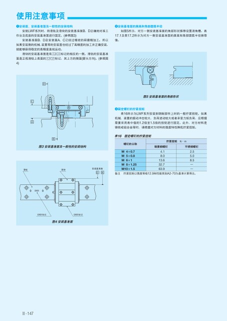 使用注意事项安装面、安装基准面及一般性的安装结构安装基准面的肩高和角部圆弧半径安装LWF系列时,将滑轨及滑块的安装基准面B、D正确地对准工作台及底座的安装基准面进行固定。(参照图3)安装基准面B、D及安装面A、C已经过精密的研磨精加工。所以如果安装侧的机械、装置等的安装面也经过了高精度的加工并正确安装,就能够获得稳定的高精度直线运动。滑块的安装基准面是有面是正视滑轨上表面的4)标记的相反的一侧。滑轨的安装基准标记,其上方的侧面(箭头方向)。(参照图如图5所示,对方一侧安装基准面的角部形状推荐设置清角槽。表17.1及表17.2所示为对方一侧安装基准面的肩高和角部圆弧半径推荐值。图5安装基准面的角部形状固定螺钉的拧紧扭矩表16所示为LWF系列安装到钢制部件上时的一般拧紧扭矩。如果机械、装置的振动冲击较大、负荷波动较大或者承受力矩负荷,应根据需要采用表中值的1.2倍至1.5倍的扭矩进行固定。此外,对方材料是铸铁或铝合金等时,请根据对方材料的强度特性降低拧紧扭矩。表16固定螺钉的拧紧扭矩螺钉的公称4×0.75×0.86×18×1.25MMMMM10×1.5拧紧扭矩N·m碳素钢螺钉不锈钢螺钉4.18.013.632.763.92.55.08.5——备注拧紧扭矩以强度等级12.9和性能类别A2-70为基准计算得出。DCAB图3安装基准面及一般性的安装结构滑轨滑块安装基准面DB标记标记图4安装基准面Ⅱ-147