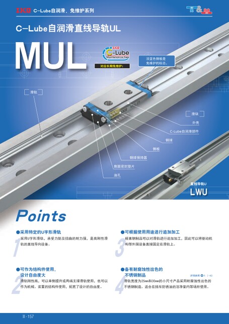 C-Lube自润滑、免维护系列C-Lube自润滑直线导轨ULMUL滑轨对应长期免维护!淡蓝色侧板是免维护的标志。滑块外壳C-Lube自润滑部件钢球侧板直线导轨ULWU钢球保持器侧面密封垫片油孔Points●采用特定的U字形滑轨●可根据使用用途进行追加加工采用U字形滑轨,承受力矩及扭曲的耐力强,是高刚性滑碳素钢制品可以对滑轨进行追加加工,因此可以将驱动机轨的直线导向设备。构等外围设备直接固定在滑轨上。●可作为结构件使用,设计自由度大●备有耐腐蚀性出色的不锈钢制品详情参照P.Ⅰ-43滑轨刚性高,可以单侧提升或两端支撑滑轨使用,也可以滑轨宽度为25mm和30mm的小尺寸产品采用耐腐蚀性出色的作为机械、装置的结构件使用,拓宽了设计的自由度。不锈钢制造。适合在排斥防锈油的洁净室内等场所使用。Ⅱ-157