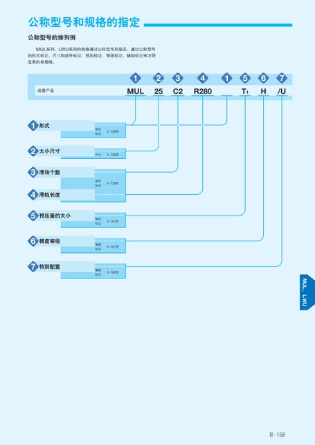 公称型号的排列例MUL系列、LWU系列的规格通过公称型号来指定。通过公称型号的形式标记、尺寸和部件标记、预压标记、等级标记、辅助标记来注明1MUL2253C241R2805T16H7/U适用的各规格。成套产品1形式234567大小尺寸滑块个数滑轨长度预压量的大小精度等级特别配置形式标记Ⅱ-159页尺寸Ⅱ-159页部件标记Ⅱ-159页预压标记Ⅱ-161页等级标记Ⅱ-161页辅助标记Ⅱ-162页Ⅱ-158
