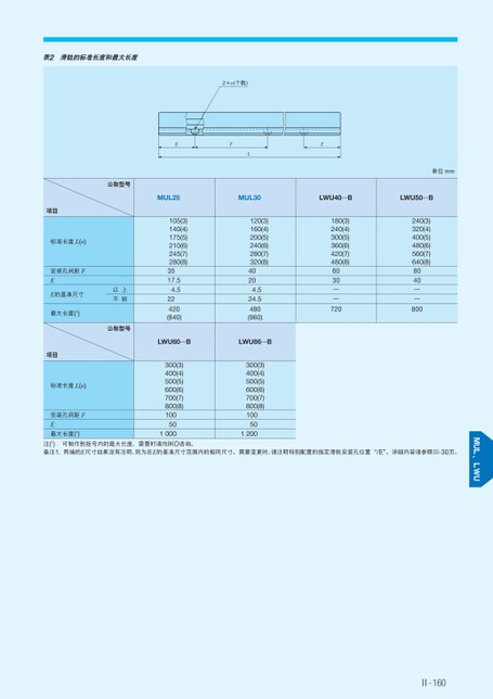 表2滑轨的标准长度和最大长度2×n(个数)EFLE单位mmMUL25MUL30LWU40…BLWU50…B180(3)240(4)300(5)360(6)420(7)480(8)6030——720240(3)320(4)400(5)480(6)560(7)640(8)8040——800105(3)140(4)175(5)210(6)245(7)280(8)3517.54.522420(840)120(3)160(4)200(5)240(6)280(7)320(8)40204.524.5480(960)LWU60…BLWU86…B300(3)400(4)500(5)600(6)700(7)800(8)100501000300(3)400(4)500(5)600(6)700(7)800(8)100501200公称型号以上不到公称型号项目标准长度L(n)安装孔间距FEE的基准尺寸最大长度(1)项目标准长度L(n)安装孔间距FE最大长度(1)可制作到括号内的最大长度,需要时请向IKO咨询。注(1)备注1.两端的E尺寸如果没有注明,则为在E的基准尺寸范围内的相同尺寸。需要变更时,请注明特别配置的指定滑轨安装孔位置“/E”。详细内容请参照Ⅲ-30页。Ⅱ-160