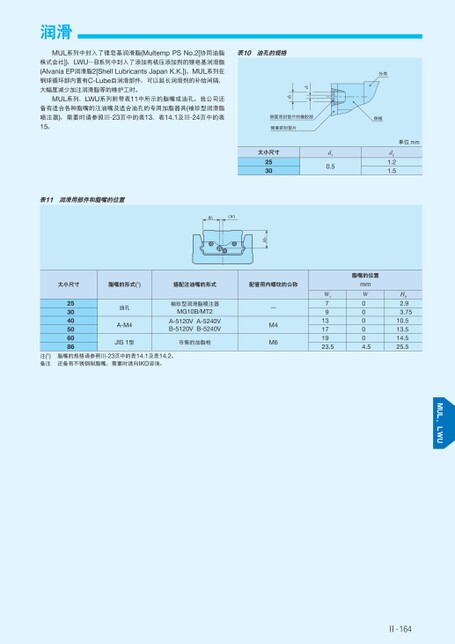Ⅱ-164大小尺寸2530d10.5单位mmd21.21.5外壳侧板d1d2侧面密封垫片的橡胶部侧面密封垫片表10油孔的规格MUL系列中封入了锂皂基润滑脂(MultempPSNo.2[协同油脂株式会社]),LWU…B系列中封入了添加有极压添加剂的锂皂基润滑脂(AlvaniaEP润滑脂2[ShellLubricantsJapanK.K.])。MUL系列在钢球循环部内置有C-Lube自润滑部件,可以延长润滑剂的补给间隔,大幅度减少加注润滑脂等的维护工时。MUL系列、LWU系列附带表11中所示的脂嘴或油孔。我公司还备有适合各种脂嘴的注油嘴及适合油孔的专用加脂器具(袖珍型润滑脂喷注器),需要时请参照Ⅲ-23页中的表13、表14.1及Ⅲ-24页中的表15。润滑H3W1(W)表11润滑用部件和脂嘴的位置大小尺寸脂嘴的形式(1)搭配注油嘴的形式配管用内螺纹的公称253040506086油孔A-M4JIS1型袖珍型润滑脂喷注器MG10B/MT2A-5120VA-5240VB-5120VB-5240V市售的加脂枪—M4M6注(1)备注脂嘴的规格请参照Ⅲ-23页中的表14.1及表14.2。还备有不锈钢制脂嘴,需要时请向IKO咨询。脂嘴的位置mmW000004.5W17913171923.5H32.93.7510.513.514.525.5