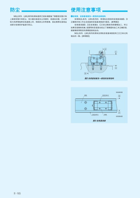 防尘使用注意事项MUL系列、LWU系列的滑块虽然已经标准配备了侧面密封垫片和上面密封垫片来防尘,但大量垃圾或灰尘浮游时,或诸如切屑、沙尘等安装面、安装基准面及一般性的安装结构安装MUL系列、LWU系列时,将滑轨及滑块的安装基准面B、D较大的异物粘附在轨道面上时,彻底防尘非常困难,因此推荐在直线运正确地对准工作台及底座的安装基准面进行固定。(参照图2)动部分安装防护盖进行防尘。安装基准面B、D及安装面A、C已经过精密的研磨精加工。所以如果安装侧的机械、装置等的安装面也经过了高精度的加工并正确安装,就能够获得稳定的高精度直线运动。MUL系列、LWU系列的滑块及滑轨安装基准面是有标记的相反的一侧。(参照图3)DCAB图2安装基准面及一般性的安装结构滑轨标记安装基准面BD标记滑块安装基准面图3安装基准面Ⅱ-165
