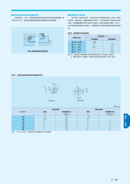Ⅱ-166安装基准面的肩高和角部圆弧半径固定螺钉的拧紧扭矩如图4所示,对方一侧安装基准面的角部形状推荐设置清角槽。表13所示为对方一侧安装基准面的肩高和角部圆弧半径推荐值。图4安装基准面的角部形状表13安装基准面的肩高和角部圆弧半径表12所示为MUL系列、LWU系列安装到钢制部件上时的一般拧紧扭矩。如果机械、装置的振动冲击较大、负荷波动较大或者承受力矩负荷,应根据需要采用表中值的1.2倍至1.5倍的扭矩进行固定。此外,对方材料是铸铁或铝合金等时,请根据对方材料的强度特性降低拧紧扭矩。表12固定螺钉的拧紧扭矩螺钉的公称MMMMM2.5×0.453×0.54×0.75×0.86×1拧紧扭矩N·m不锈钢螺钉碳素钢螺钉0.621.12.5———1.84.18.013.6备注1.拧紧扭矩以强度等级12.9和性能类别A2-70为基准计算得出。2.精密设备用十字槽盘头小螺丝的拧紧扭矩请参照Ⅲ-38页表22。h2R2R2滑轨安装部R1R1h1滑块安装部大小尺寸253040506086滑块安装部滑轨安装部肩高h11.52.53334角部圆弧半径R1(最大)0.20.20.50.50.50.5肩高h22.5357911单位mm角部圆弧半径R2(最大)(1)——1222注(1)大小尺寸为25、30的系列应设置图4所示的清角槽。