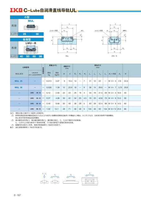 脂嘴(4)H3W6NW2W3W5WLWU⋯B4-M1×深度W4油孔H3NW22-M1×深度W4HHW6W5WMUL小型MUL形状大小尺寸2530标准型LWU⋯B形状大小尺寸40506086C-Lube自润滑直线导轨UL质量(参考)装配尺寸mm滑块尺寸mm滑块kg滑轨kg/mHNW2W3W4L1L2L3L4M1×深度H3W自由组合公称型号MUL系列LWU系列(无C-Lube自润滑部件)MUL25MUL30———0.0130.87919.414——0.0281.3923.918—311222—M3×52.924.9381428.6—M4×73.7529.9794————LWU40…B—LWU50…B—LWU60…B—0.120.270.402.654.066.66LWU86…B—1.3214.12618551831.559M3×510.534254.5702542.873M4×613.53828564655832852.488M5×814.51304693134M6×1225.540506086122430354833424971注(1)(2)(3)(4)备注滑轨长度L记载于Ⅱ-160页上的表2中。附带的滑轨安装用螺栓是相当于JISB1176的内六角螺栓或精密设备用十字槽盘头小螺丝。大小尺寸为25、30的系列附带不锈钢螺栓。MUL系列不附带滑轨安装用螺栓。基本额定动负荷(C)、基本额定静负荷(C0)、额定静力矩(T0、TX、TY)为下图的方向的数值。TX、TY栏中上方值为使用1个滑块时的值,下方值为使用2个紧靠的滑块时的值。脂嘴的形状因大小而异。规格详情请参照Ⅱ-164页中的表11。油孔规格请参照Ⅱ-164页中的表10。C、C0T0TXTYⅡ-167
