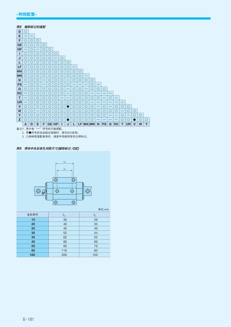 -特别配置-表8辅助标记的搭配DEFGEHPIJLLFMAMNNPSQRCTURVWYZ○—○○—○○○○○○○—○———○○○○A—○○○○○○○○○○○○○○○○○○○D○○—○○○○○○○○○○○○○—○○E○○○○○○○○——○○○○○○○○F○○○○○○○○○○○○○○○○○—○○○○○○○○○○○○○○GE○HP○○○○○○○○○—○○○○○I○○○○—○———○●○○●J—○○○—○○○○○○○○L○○○—○○○○○○○○LF—○——○○○○○○○○○○—○—○○○○MAMN—○—○——○○—N○———○○○—PS—○——○——Q——○○——RC—○—○○T○○—○UR○○●V○○W○Y备注1.表中有“—”符号的不能搭配。2.带●符号的自由组合规格时,请向IKO咨询。3.几种种类搭配使用时,请按字母顺序排列注明标记。表9滑块中央安装孔间距尺寸(辅助标记/GE)L2L6L230404552628095110200单位mmL62635404452607082150大小尺寸1520253035455565100Ⅱ-181