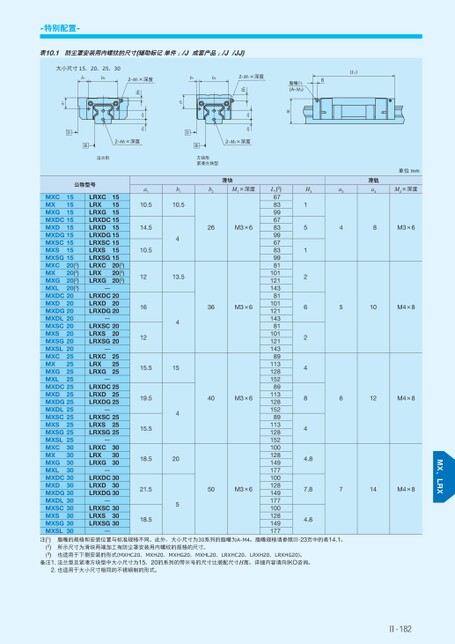 (L1)6脂嘴(1)(A-M3)※单位mmM2×深度滑轨a48M3×6a34510M4×8612M4×8H31512624844.87.8714M4×84.8L1(2)678399678399678399811011211438110112114381101121143891131281528911312815289113128152100128149177100128149177100128149177-特别配置-表10.1防尘罩安装用内螺纹的尺寸(辅助标记单件:/J成套产品:/J/JJ)大小尺寸15、20、25、30b1b22-M1×深度b1b22-M1×深度H3a4a32-M2×深度DB方块形紧凑方块型滑块b2M1×深度26M3×6a1b110.54a110.514.510.51213.51612415.51519.515.5418.52021.518.5536M3×640M3×650M3×6a4a3H32-M2×深度法兰形DBa1公称型号20(3)20(3)20(3)20(3)15MXC15MX15MXGMXDC15MXD15MXDG15MXSC15MXS15MXSG15MXCMXMXGMXLMXDC20MXD20MXDG20MXDL20MXSC20MXS20MXSG2020MXSL25MXC25MXMXG25MXL25MXDC25MXD25MXDG25MXDL25MXSC25MXS25MXSG2525MXSLMXC3030MX30MXGMXL30MXDC30MXD30MXDG30MXDL30MXSC30MXS30MXSG3030MXSL15LRXC15LRX15LRXGLRXDC15LRXD15LRXDG15LRXSC15LRXS15LRXSG15LRXCLRXLRXG—20(3)20(3)20(3)LRXDC20LRXD20LRXDG20—LRXSC20LRXS20LRXSG20—LRXCLRXLRXG—252525LRXDC25LRXD25LRXDG25—LRXSC25LRXS25LRXSG25—LRXCLRXLRXG—303030LRXDC30LRXD30LRXDG30—LRXSC30LRXS30LRXSG30—脂嘴的规格和安装位置与标准规格不同。此外,大小尺寸为30系列的脂嘴为A-M4。脂嘴规格请参照Ⅲ-23页中的表14.1。所示尺寸为滑块两端加工有防尘罩安装用内螺纹的规格的尺寸。注(1)(2)(3)备注1.法兰型及紧凑方块型中大小尺寸为15、20的系列的带※号的尺寸比装配尺寸H高。详细内容请向IKO咨询。2.也适用于大小尺寸相同的不锈钢制的形式。也适用于下侧安装的形式(MXHC20、MXH20、MXHG20、MXHL20、LRXHC20、LRXH20、LRXHG20)。Ⅱ-182