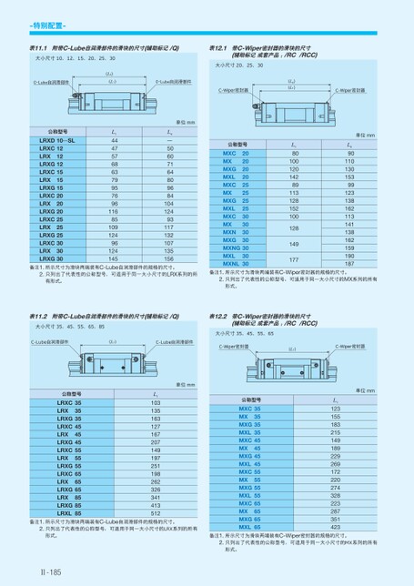 -特别配置-表11.1附带C-Lube自润滑部件的滑块的尺寸(辅助标记/Q)大小尺寸10、12、15、20、25、30表12.1带C-Wiper密封器的滑块的尺寸(辅助标记成套产品:/RC/RCC)大小尺寸20、25、30C-Lube自润滑部件(L4)(L1)C-Lube自润滑部件公称型号LRXD10…SLLRXC12LRX12LRXG12LRXC15LRX15LRXG15LRXC20LRX20LRXG20LRXC25LRX25LRXG25LRXC30LRX30LRXG30L14447576863799576961168510912496124145单位mmL4—5060716480968410412493117132107135156备注1.所示尺寸为滑块两端装有C-Lube自润滑部件的规格的尺寸。2.只列出了代表性的公称型号,可适用于同一大小尺寸的LRX系列的所有形式。C-Wiper密封器公称型号20MXC20MX20MXG20MXL25MXC25MX25MXG25MXL30MXC30MX30MXNMXG30MXNG30MXL30MXNL30(L4)(L1)L18010012014289113128152100128149177C-Wiper密封器单位mmL49011013015399123138162113141138162159190187备注1.所示尺寸为滑块两端装有C-Wiper密封器的规格的尺寸。2.只列出了代表性的公称型号,可适用于同一大小尺寸的MX系列的所有形式。表11.2附带C-Lube自润滑部件的滑块的尺寸(辅助标记/Q)大小尺寸35、45、55、65、85表12.2带C-Wiper密封器的滑块的尺寸(辅助标记成套产品:/RC/RCC)大小尺寸35、45、55、65C-Lube自润滑部件(L1)C-Lube自润滑部件C-Wiper密封器(L1)C-Wiper密封器公称型号LRXC35LRX35LRXG35LRXC45LRX45LRXG45LRXC55LRX55LRXG55LRXC65LRX65LRXG65LRX85LRXG8585LRXLL1103135163127167207149197251198262326341413512备注1.所示尺寸为滑块两端装有C-Lube自润滑部件的规格的尺寸。2.只列出了代表性的公称型号,可适用于同一大小尺寸的LRX系列的所有形式。Ⅱ-185单位mm单位mm公称型号MXC35MX35MXG35MXL35MXC45MX45MXG45MXL45MXC55MX55MXG55MXL55MXC65MX65MXG65MXL65L1123155183215149189229269172220274328223287351423备注1.所示尺寸为滑块两端装有C-Wiper密封器的规格的尺寸。2.只列出了代表性的公称型号,可适用于同一大小尺寸的MX系列的所有形式。