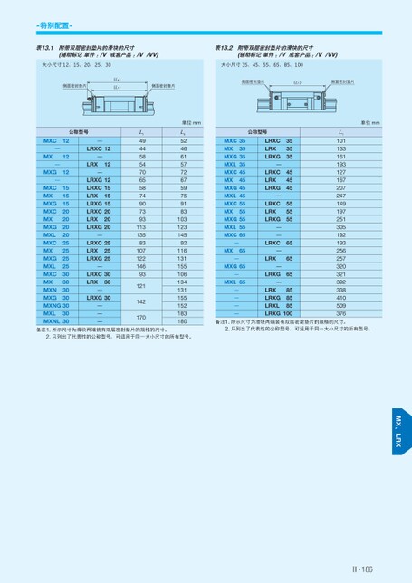 -特别配置-表13.1附带双层密封垫片的滑块的尺寸(辅助标记单件:/V成套产品:/V/VV)表13.2附带双层密封垫片的滑块的尺寸(辅助标记单件:/V成套产品:/V/VV)大小尺寸12、15、20、25、30大小尺寸35、45、55、65、85、100侧面密封垫片(L4)(L1)侧面密封垫片侧面密封垫片(L1)侧面密封垫片单位mm单位mm公称型号MXC—MX121212—MXG—15MXC15MX15MXG20MXC20MX20MXG20MXL25MXC25MX25MXG25MXL30MXC30MX30MXN30MXGMXNG30MXL30MXNL30—LRXC12—LRX12—LRXG12LRXC15LRX15LRXG15LRXC20LRX20LRXG20—LRXC25LRX25LRXG25—LRXC30LRX30—LRXG30———L149445854706558749073931131358310712214693121142170L45246615772675975918310312314592116131155106134131155152183180备注1.所示尺寸为滑块两端装有双层密封垫片的规格的尺寸。2.只列出了代表性的公称型号,可适用于同一大小尺寸的所有型号。MXC35MX35MXG35MXL35MXC45MX45MXG45MXL45MXC55MX55MXG55MXL55MXC65—MX65—MXG65—MXL65————公称型号35353545454555555565LRXCLRXLRXG—LRXCLRXLRXG—LRXCLRXLRXG——LRXC—LRX65—LRXG—6585LRX85LRXGLRXL85LRXG100L1101133161193127167207247149197251305192193256257320321392338410509376备注1.所示尺寸为滑块两端装有双层密封垫片的规格的尺寸。2.只列出了代表性的公称型号,可适用于同一大小尺寸的所有型号。Ⅱ-186