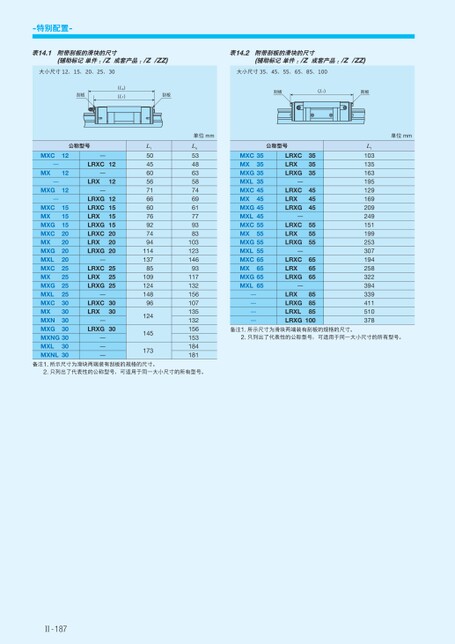 -特别配置-表14.1附带刮板的滑块的尺寸(辅助标记单件:/Z成套产品:/Z/ZZ)表14.2附带刮板的滑块的尺寸(辅助标记单件:/Z成套产品:/Z/ZZ)大小尺寸12、15、20、25、30大小尺寸35、45、55、65、85、100刮板(L4)(L1)刮板刮板(L1)刮板单位mm单位mm公称型号MXC—MX121212—MXG—15MXC15MX15MXG20MXC20MX20MXG20MXL25MXC25MX25MXG25MXL30MXC30MX30MXN30MXGMXNG30MXL30MXNL30—LRXC—12LRX1212151515202020252525303030—LRXGLRXCLRXLRXGLRXCLRXLRXG—LRXCLRXLRXG—LRXCLRX—LRXG———L150456056716660769274941141378510912414896124145173L45348635874696177938310312314693117132156107135132156153184181备注1.所示尺寸为滑块两端装有刮板的规格的尺寸。2.只列出了代表性的公称型号,可适用于同一大小尺寸的所有型号。MXC35MX35MXG35MXL35MXC45MX45MXG45MXL45MXC55MX55MXG55MXL55MXC65MX65MXG65MXL65————公称型号353535454545555555656565LRXCLRXLRXG—LRXCLRXLRXG—LRXCLRXLRXG—LRXCLRXLRXG—85LRX85LRXGLRXL85LRXG100L1103135163195129169209249151199253307194258322394339411510378备注1.所示尺寸为滑块两端装有刮板的规格的尺寸。2.只列出了代表性的公称型号,可适用于同一大小尺寸的所有型号。Ⅱ-187