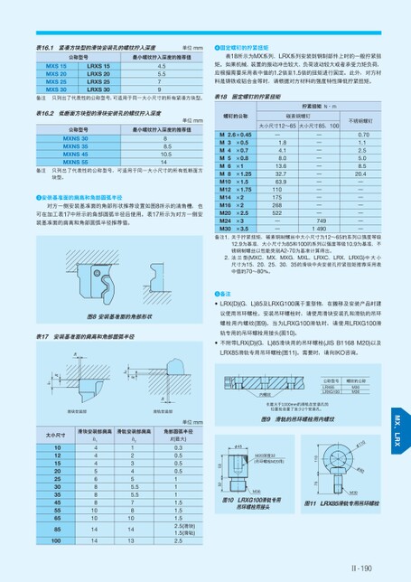 表16.1紧凑方块型的滑块安装孔的螺纹拧入深度单位mm固定螺钉的拧紧扭矩公称型号最小螺纹拧入深度的推荐值MXS15MXS20MXS25MXS30LRXS15LRXS20LRXS25LRXS304.55.579表18所示为MX系列、LRX系列安装到钢制部件上时的一般拧紧扭矩。如果机械、装置的振动冲击较大、负荷波动较大或者承受力矩负荷,应根据需要采用表中值的1.2倍至1.5倍的扭矩进行固定。此外,对方材料是铸铁或铝合金等时,请根据对方材料的强度特性降低拧紧扭矩。备注只列出了代表性的公称型号,可适用于同一大小尺寸的所有紧凑方块型。表18固定螺钉的拧紧扭矩表16.2低断面方块型的滑块安装孔的螺纹拧入深度公称型号MXNS30MXNS35MXNS45MXNS55单位mm最小螺纹拧入深度的推荐值88.510.514备注只列出了代表性的公称型号,可适用于同一大小尺寸的所有低断面方块型。安装基准面的肩高和角部圆弧半径对方一侧安装基准面的角部形状推荐设置如图8所示的清角槽,也可在加工表17中所示的角部圆弧半径后使用。表17所示为对方一侧安装基准面的肩高和角部圆弧半径推荐值。图8安装基准面的角部形状表17安装基准面的肩高和角部圆弧半径拧紧扭矩N·m螺钉的公称碳素钢螺钉大小尺寸12~65大小尺寸85、100不锈钢螺钉2.6×0.45M3M4M5M6MM8M10M12M14M16M20M24M30×0.5×0.7×0.8×1×1.25×1.5×1.75×2×2×2.5×3×3.5—1.84.18.013.632.763.9110175268522—————————————74914900.701.12.55.08.520.4———————备注1.关于拧紧扭矩,碳素钢制螺丝中大小尺寸为12~65的系列以强度等级12.9为基准、大小尺寸为85和100的系列以强度等级10.9为基准、不锈钢制螺丝以性能类别A2-70为基准计算得出。2.法兰型(MXC、MX、MXG、MXL、LRXC、LRX、LRXG)中大小尺寸为15、20、25、30、35的滑块中央安装孔拧紧扭矩推荐采用表中值的70~80%。备注•LRX(D)(G、L)85及LRXG100属于重型物,在搬移及安装产品时建议使用吊环螺栓。安装吊环螺栓时,请使用滑块安装孔和滑轨的吊环螺栓用内螺纹(图9)。当为LRXG100滑轨时,请使用LRXG100滑轨专用的吊环螺栓用接头(图10)。•不附带LRX(D)(G、L)85滑块用的吊环螺栓(JISB1168M20)以及LRX85滑轨专用吊环螺栓(图11)。需要时,请向IKO咨询。内螺纹公称型号螺纹的公称LRX85LRXG100M30M36长度大于1000mm的滑轨在安装孔的位置处设置了至少2个安装孔。图9滑轨的吊环螺栓用内螺纹R滑轨安装部单位mmRh2011φφ6011075φ45M20深度32(吊环螺栓M20用)5332M36图10LRXG100滑轨专用吊环螺栓用接头M30图11LRX85滑轨专用吊环螺栓Ⅱ-190大小尺寸1012152025303545556585100滑块安装部肩高滑轨安装部肩高角部圆弧半径h14445688810101414h2123455.55.578101413R(最大)0.30.50.50.51111.51.51.52.5(滑块)1.5(滑轨)2.5滑块安装部RRh1