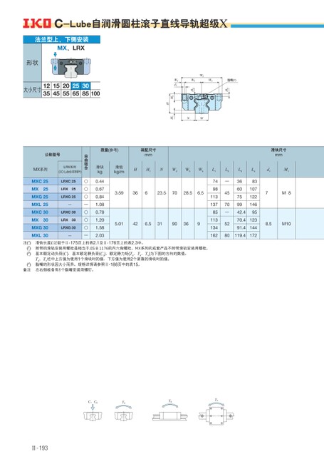 C、C0T0TXTY质量(参考)装配尺寸mm滑块kg滑轨kg/mHH1NW2W3W4L10.440.670.841.080.781.201.582.033.5936623.57028.56.55.01426.53190369749811313785113134162滑块尺寸mmd1M17M88.5M10L2—4570—52L33660759942.470.491.480119.4L48310712214695123144172自由组合○○○—○○○—公称型号MX系列MXC25MX25MXG25MXL25MXC30MX30MXG30MXL30LRX系列(无C-Lube自润滑部件)LRXC25LRX25LRXG25—LRXC30LRX30LRXG30—注(1)(2)(3)(4)备注滑轨长度L记载于Ⅱ-175页上的表2.1及Ⅱ-176页上的表2.3中。附带的滑轨安装用螺栓是相当于JISB1176的内六角螺栓。MX系列的成套产品不附带滑轨安装用螺栓。基本额定动负荷(C)、基本额定静负荷(C0)、额定静力矩(T0、TX、TY)为下图的方向的数值。TX、TY栏中上方值为使用1个滑块时的值,下方值为使用2个紧靠的滑块时的值。脂嘴的形状因大小而异。规格详情请参照Ⅱ-188页中的表15。左右侧板各有1个脂嘴安装用螺钉。C-Lube自润滑圆柱滚子直线导轨超级XH3W3脂嘴(4)W2W3H5W4d1H2HNWH1法兰型上、下侧安装MX、LRX形状大小尺寸12351545205525653085100Ⅱ-193