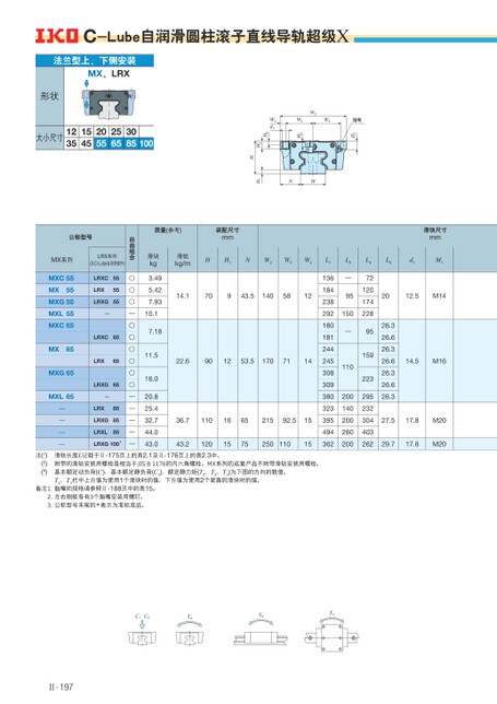 C、C0T0TXTY质量(参考)装配尺寸mm滑块kg3.495.427.9310.17.1811.516.020.825.432.744.043.0滑轨kg/mHH1NW2W3W4L114.170943.5140581222.6901253.5170711436.7110166521592.51543.2120157525011015136184238292180181244245308309380323395494362滑块尺寸mmL3L5d1M1721201742282012.5M14L2—95150—9515922329523230440326211020014020028020026.326.626.326.626.326.626.314.5M1627.517.8M2029.717.8M20自由组合○○○—○○○○○○—————公称型号MX系列MXC55MX55MXG55MXL55MXC65MX65MXG65LRX系列(无C-Lube自润滑部件)LRXC55LRX55LRXG55—LRXC65LRX65LRXG65MXL65—————LRX85LRXG85LRXL85LRXG100*C-Lube自润滑圆柱滚子直线导轨超级XH3W3脂嘴W2W3H5W4d1H6H2HNWH1法兰型上、下侧安装MX、LRX形状大小尺寸12351545205525653085100滑轨长度L记载于Ⅱ-175页上的表2.1及Ⅱ-176页上的表2.3中。附带的滑轨安装用螺栓是相当于JISB1176的内六角螺栓。MX系列的成套产品不附带滑轨安装用螺栓。基本额定动负荷(C)、基本额定静负荷(C0)、额定静力矩(T0、TX、TY)为下图的方向的数值。TX、TY栏中上方值为使用1个滑块时的值,下方值为使用2个紧靠的滑块时的值。注(1)(2)(3)备注1.脂嘴的规格请参照Ⅱ-188页中的表15。2.左右侧板各有3个脂嘴安装用螺钉。3.公称型号末尾的*表示为准标准品。Ⅱ-197