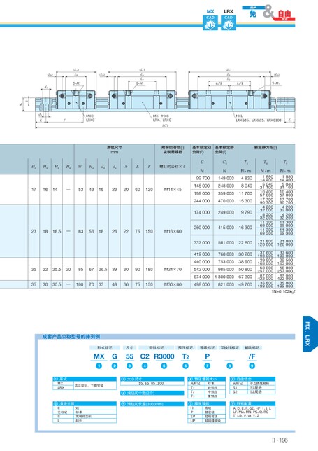 MXCADLRXCAD(L5)d4(L1)L33-M1(L5)(L1)L3L26-M1(L1)L3L2L2/2L2/2(L5)9-M1MX、MXGLRX、LRXGL(1)MXLLRXG85、LRXL85、LRXG100E滑轨尺寸mm附带的滑轨(2)安装用螺栓基本额定动负荷(3)基本额定静负荷(3)额定静力矩(3)d3EFMXCLRXChH4H2H3H5H6WH4d3d4hEF螺钉的公称×R171614—534316232060120M14×45231818.5—635618262275150M16×60352225.520856726.5393090180M24×70CN99700148000198000244000C0N149000248000T0N·m48308040359000117004700001530017400024900097902600004150001630033700058100022800419000440000542000768000302007530003890098500050800674000130000067300353030.5—1007033483675150M30×8049800082100049700TXTYN·m1880144005040311001040057000177009070042003200042003220011300690001130069300N·m18801440050403110010400570001770090700420032000420032200113006900011300693002180012000021800120000376001930002950016300050000257000870004220003580019900037600193000295001630005000025700087000422000358001990001N≈0.102kgf成套产品公称型号的排列例形式标记MX1G2尺寸553部件标记预压标记等级标记互换性标记辅助标记C2R300045T26P7/F981形式MXLRX法兰型上、下侧安装2滑块长度C无标记GL短标准高刚性加长超长3大小尺寸55、65、85、10045滑块的个数(2个)滑轨的长度(3000mm)6预压量的大小8自由组合无标记T1T2T3标准轻预压中预压重预压精度等级7HPSPUP高级精密级超精密级超超精密级无标记S1S2非互换性规格S1规格S2规格特别配置9A、D、E、F、GE、HP、Ⅰ、J、LLF、MA、MN、PS、Q、RCT、UR、V、W、Y、ZⅡ-198