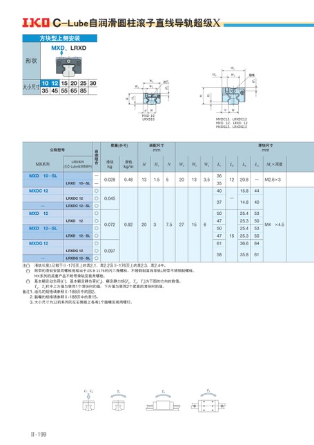 C、C0T0TXTYC-Lube自润滑圆柱滚子直线导轨超级XNWMXD10LRXD10NWMXDC12、LRXDC12MXD12MXDG12、LRXDG1212、LRXDH3脂嘴W2W3W4H1HH1H油孔H3W2W3W4大小尺寸1035124515552065258530方块型上侧安装MXD、LRXD形状质量(参考)装配尺寸mm滑块kg滑轨kg/mHH1NW2W3W40.0280.48131.5520133.50.0450.0720.922037.5271560.097滑块尺寸mmL2L3L4M1×深度M2.6×3M4×4.51220.8—1515.814.825.425.325.425.336.635.8—4440535053506461L136354037504750476158自由组合——○○○○○○○○○○公称型号MX系列LRX系列(无C-Lube自润滑部件)MXD10…SLMXDC12LRXD10…SLLRXDC12—LRXDC12…SLMXD12MXD12…SLMXDG12LRXD12LRXD12…SLLRXDG12—LRXDG12…SL滑轨长度L记载于Ⅱ-175页上的表2.1、表2.2及Ⅱ-176页上的表2.3、表2.4中。附带的滑轨安装用螺栓是相当于JISB1176的内六角螺栓。不锈钢制直线导轨L附带不锈钢制螺栓。MX系列的成套产品不附带滑轨安装用螺栓。注(1)(2)(3)基本额定动负荷(C)、基本额定静负荷(C0)、额定静力矩(T0、TX、TY)为下图的方向的数值。TX、TY栏中上方值为使用1个滑块时的值,下方值为使用2个紧靠的滑块时的值。备注1.油孔的规格请参照Ⅱ-188页中的图2。2.脂嘴的规格请参照Ⅱ-188页中的表15。3.大小尺寸为12的系列的左右侧板上各有1个脂嘴安装用螺钉。Ⅱ-199
