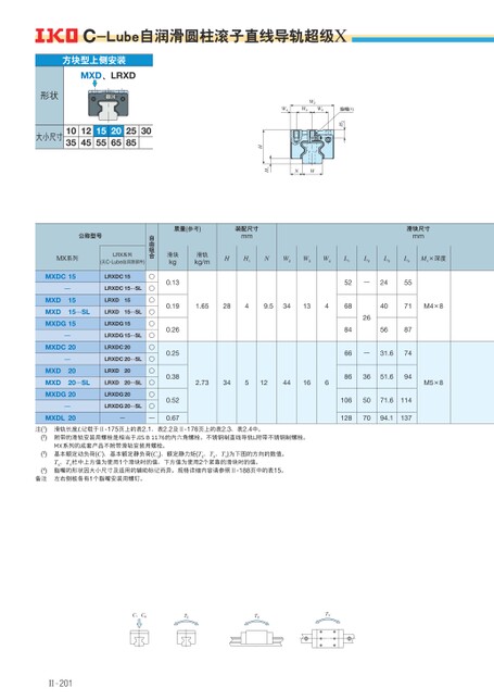 C、C0T0TXTY质量(参考)装配尺寸mm滑块尺寸mmHH1NW2W3W4L1L2L3L4M1×深度0.191.652849.53413452—2455688426405671M4×88766—31.67420…SLLRXD20…SLMXDG20LRXDG20—LRXDG20…SLMXDL20—2.733451244166863651.694M5×8106128507071.611494.1137注(1)(2)(3)(4)备注滑轨长度L记载于Ⅱ-175页上的表2.1、表2.2及Ⅱ-176页上的表2.3、表2.4中。附带的滑轨安装用螺栓是相当于JISB1176的内六角螺栓。不锈钢制直线导轨L附带不锈钢制螺栓。MX系列的成套产品不附带滑轨安装用螺栓。基本额定动负荷(C)、基本额定静负荷(C0)、额定静力矩(T0、TX、TY)为下图的方向的数值。TX、TY栏中上方值为使用1个滑块时的值,下方值为使用2个紧靠的滑块时的值。脂嘴的形状因大小尺寸及适用的辅助标记而异。规格详细内容请参照Ⅱ-188页中的表15。左右侧板各有1个脂嘴安装用螺钉。Ⅱ-2010.260.250.380.520.67自由组合○○○○○○○○○○○○—公称型号MX系列LRX系列(无C-Lube自润滑部件)滑轨kg/m滑块kg0.1315…SLLRXD15…SLMXDG15LRXDG15—LRXDG15…SLLRXDC15LRXDC15…SLLRXD15LRXDC20LRXDC20…SLLRXD20MXDC15—15MXDMXDMXDC20—20MXDMXDC-Lube自润滑圆柱滚子直线导轨超级XH3W2W4W3W3脂嘴(4)NWH1H方块型上侧安装MXD、LRXD形状大小尺寸1035124515552065258530
