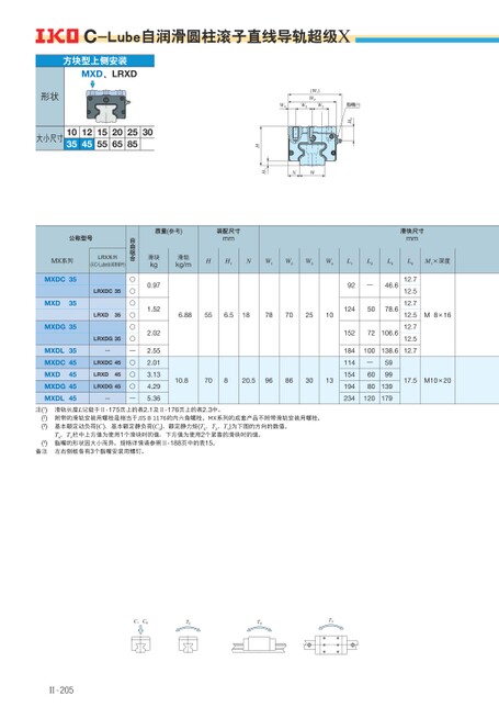 C、C0T0TXTY滑轨kg/mHH1NW1W2W3W4L192L2—46.66.88556.518787025101245078.615272106.6滑块尺寸mmL3L5M1×深度12.712.512.712.512.712.5M8×1610.870820.596863013184114154194234100138.612.7—6080120599913917917.5M10×20注(1)(2)(3)(4)备注滑轨长度L记载于Ⅱ-175页上的表2.1及Ⅱ-176页上的表2.3中。附带的滑轨安装用螺栓是相当于JISB1176的内六角螺栓。MX系列的成套产品不附带滑轨安装用螺栓。基本额定动负荷(C)、基本额定静负荷(C0)、额定静力矩(T0、TX、TY)为下图的方向的数值。TX、TY栏中上方值为使用1个滑块时的值,下方值为使用2个紧靠的滑块时的值。脂嘴的形状因大小而异。规格详情请参照Ⅱ-188页中的表15。左右侧板各有3个脂嘴安装用螺钉。Ⅱ-205质量(参考)装配尺寸mm滑块kg0.971.522.022.552.013.134.295.36自由组合○○○○○○—○○○—公称型号MX系列LRX系列(无C-Lube自润滑部件)MXDC35MXD35MXDG35MXDL35MXDC45MXD45MXDG45MXDL45LRXDC35LRXD35LRXDG35—LRXDC45LRXD45LRXDG45—C-Lube自润滑圆柱滚子直线导轨超级XH3(W1)W2W4W3W3脂嘴(4)NWH1H方块型上侧安装MXD、LRXD形状大小尺寸1035124515552065258530