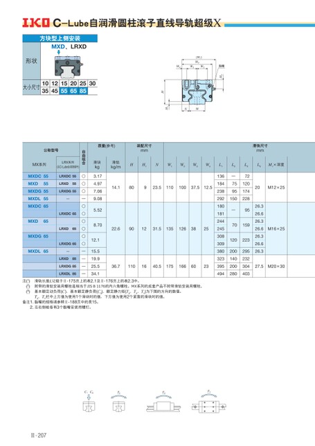 C、C0T0TXTY质量(参考)装配尺寸mm滑块kg3.174.977.069.085.528.7012.115.519.925.534.1滑轨kg/mHH1NW1W2W3W4L114.180923.511010037.512.522.6901231.5135126382536.71101640.51751666023136184238292180181244245308309380323395494滑块尺寸mmL3L5M1×深度7212017422820M12×25L2—759515026.326.626.326.626.326.626.3M16×2527.5M20×30—9570159120223200140200280295232304403自由组合○○○—○○○○○○————公称型号MX系列LRX系列(无C-Lube自润滑部件)MXDC55MXD55MXDG55MXDL55MXDC65MXD65MXDG65LRXDC55LRXD55LRXDG55—LRXDC65LRXD65LRXDG65MXDL65—LRXD85LRXDG85LRXDL85C-Lube自润滑圆柱滚子直线导轨超级X脂嘴H3(W1)W2W4W3W3NWH1H方块型上侧安装MXD、LRXD形状大小尺寸1035124515552065258530滑轨长度L记载于Ⅱ-175页上的表2.1及Ⅱ-176页上的表2.3中。附带的滑轨安装用螺栓是相当于JISB1176的内六角螺栓。MX系列的成套产品不附带滑轨安装用螺栓。注(1)(2)(3)基本额定动负荷(C)、基本额定静负荷(C0)、额定静力矩(T0、TX、TY)为下图的方向的数值。TX、TY栏中上方值为使用1个滑块时的值,下方值为使用2个紧靠的滑块时的值。备注1.脂嘴的规格请参照Ⅱ-188页中的表15。2.左右侧板各有3个脂嘴安装用螺钉。Ⅱ-207