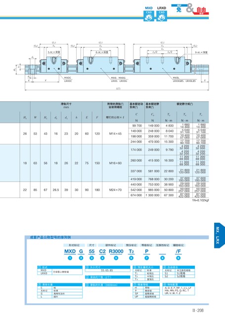 MXDCADLRXDCAD(L1)L33-M1×深度(L5)(L1)L3L26-M1×深度(L5)d4(L1)L3L2(L5)L2/2L2/29-M1×深度MXD、MXDGLRXD、LRXDGL(1)MXDLLRXDG85、LRXDL85Ed3EFMXDCLRXDChH4滑轨尺寸mm附带的滑轨(2)安装用螺栓基本额定动负荷(3)基本额定静负荷(3)额定静力矩(3)H3WH4d3d4hEF螺钉的公称×R26534316232060120M14×4518635618262275150M16×6022856726.5393090180M24×70CN99700148000198000244000C0N149000248000359000470000T0N·m48308040117001530017400024900097902600004150001630033700058100022800419000440000542000768000753000985000674000130000030200389005080067300TXN·m18801440050403110010400570001770090700420032000420032200113006900011300693002180012000037600193000295001630005000025700087000422000TYN·m188014400504031100104005700017700907004200320004200322001130069000113006930021800120000376001930002950016300050000257000870004220001N≈0.102kgf成套产品公称型号的排列例形式标记MXD1G2尺寸553部件标记预压标记等级标记互换性标记辅助标记C2R300045T26P7/F981形式MXDLRXD方块型上侧安装2滑块长度C无标记GL短标准高刚性加长超长3大小尺寸55、65、8545滑块的个数(2个)滑轨的长度(3000mm)6预压量的大小8自由组合无标记T1T2T3标准轻预压中预压重预压精度等级7HPSPUP高级精密级超精密级超超精密级无标记S1S2非互换性规格S1规格S2规格特别配置9A、D、E、F、HP、Ⅰ、J、L、LFMA、MN、PS、Q、RC、TUR、V、W、Y、ZⅡ-208