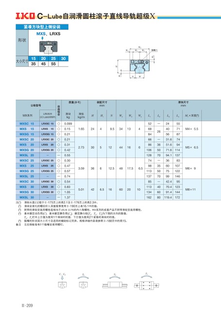 C、C0T0TXTY质量(参考)装配尺寸mm滑块尺寸mm滑轨kg/m滑块kg0.099HH1NW2W3W41.652449.534132.73305124416463.5936612.54817.56.55.01426.5166020100.150.210.210.310.420.550.300.470.570.740.540.831.051.37L15268846686106128749811313785113134162L2—26—365070—355070—406080L324405631.651.671.694.13660759942.470.491.4119.4L455718774941141378310712214695123144172M1×深度(2)M4×5.5M5×6.5M6×9M8×11自由组合○○○○○○—○○○—○○○—公称型号MX系列LRX系列(无C-Lube自润滑部件)MXSCMXSMXSGMXSCMXSMXSGMXSLMXSCMXSMXSGMXSLMXSCMXSMXSGMXSL151515202020202525252530303030LRXSC15LRXS15LRXSG15LRXSC20LRXS20LRXSG20—LRXSC25LRXS25LRXSG25—LRXSC30LRXS30LRXSG30—注(1)(2)(3)(4)(5)备注滑轨长度L记载于Ⅱ-175页上的表2.1及Ⅱ-176页上的表2.3中。滑块安装孔的螺纹拧入深度推荐使用Ⅱ-190页上表16.1中的值。附带的滑轨安装用螺栓是相当于JISB1176的内六角螺栓。MX系列的成套产品不附带滑轨安装用螺栓。基本额定动负荷(C)、基本额定静负荷(C0)、额定静力矩(T0、TX、TY)为下图的方向的数值。TX、TY栏中上方值为使用1个滑块时的值,下方值为使用2个紧靠的滑块时的值。脂嘴的形状因大小尺寸及适用的辅助标记而异。规格详细内容请参照Ⅱ-188页中的表15。左右侧板各有1个脂嘴安装用螺钉。C-Lube自润滑圆柱滚子直线导轨超级XH3W2W4W3W3脂嘴(5)NWH1H紧凑方块型上侧安装MXS、LRXS形状大小尺寸15352045255530Ⅱ-209