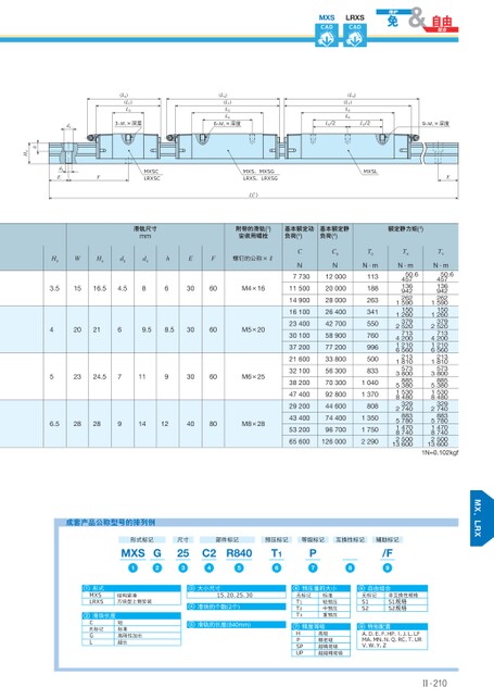 MXSCADLRXSCAD(L4)(L1)L3d43-M1×深度(L4)(L1)L3L26-M1×深度(L4)(L1)L3L2L2/2L2/29-M1×深度MXS、MXSGLRXS、LRXSGL(1)MXSLEd3EFMXSCLRXSChH4滑轨尺寸mm附带的滑轨(3)安装用螺栓基本额定动负荷(4)基本额定静负荷(4)额定静力矩(4)H3WH4d3d43.51516.54.58h6EF螺钉的公称×R3060M4×1645202169.58.53060M5×202324.571193060M6×256.52828914124080M8×28CN77301150014900161002340030100372002160032100382004740029200434005320065600C0N1200020000280002640042700589007720033800563007030092800446007440096700126000T0TXN·mN·mTYN·m1131882633415507609965008331040137080813501750229050.645713694226215901501260379252071342001210656021318105733800885538015308480329274088357801470874025001360050.64571369422621590150126037925207134200121065602131810573380088553801530848032927408835780147087402500136001N≈0.102kgf成套产品公称型号的排列例形式标记MXS1G2尺寸253部件标记预压标记等级标记互换性标记辅助标记C2R84045T16P7/F981形式MXSLRXS结构紧凑方块型上侧安装2滑块长度C无标记GL短标准高刚性加长超长3大小尺寸15、20、25、304滑块的个数(2个)5滑轨的长度(840mm)6预压量的大小8自由组合无标记T1T2T3标准轻预压中预压重预压精度等级7HPSPUP高级精密级超精密级超超精密级无标记S1S2非互换性规格S1规格S2规格特别配置9A、D、E、F、HP、Ⅰ、J、L、LFMA、MN、N、Q、RC、T、URV、W、Y、ZⅡ-210