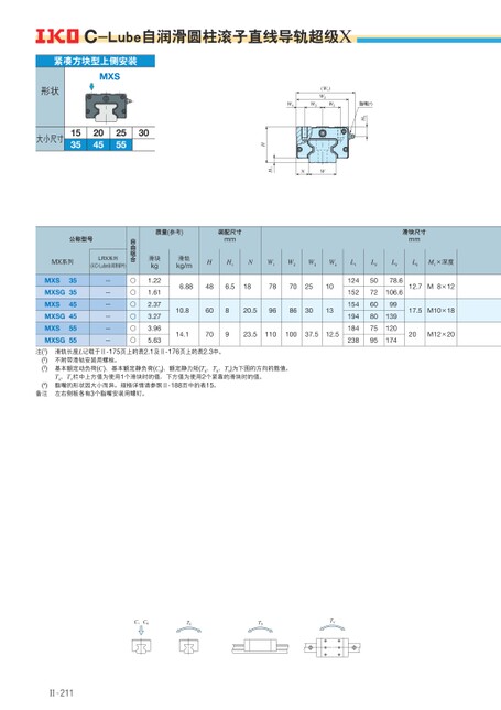C、C0T0TXTY质量(参考)装配尺寸mm滑块kg1.221.612.373.273.965.63滑轨kg/mHH1NW1W2W3W4L16.88486.5187870251010.814.160708920.59686301323.511010037.512.5124152154194184238滑块尺寸mmL2507260807595L3L5M1×深度78.6106.69913912017412.7M8×1217.5M10×1820M12×20自由组合○○○○○○公称型号MX系列LRX系列(无C-Lube自润滑部件)MXSMXSGMXSMXSGMXSMXSG353545455555——————注(1)(2)(3)(4)备注滑轨长度L记载于Ⅱ-175页上的表2.1及Ⅱ-176页上的表2.3中。不附带滑轨安装用螺栓。基本额定动负荷(C)、基本额定静负荷(C0)、额定静力矩(T0、TX、TY)为下图的方向的数值。TX、TY栏中上方值为使用1个滑块时的值,下方值为使用2个紧靠的滑块时的值。脂嘴的形状因大小而异。规格详情请参照Ⅱ-188页中的表15。左右侧板各有3个脂嘴安装用螺钉。C-Lube自润滑圆柱滚子直线导轨超级X脂嘴(4)H3(W1)W2W4W3W3NWH1H紧凑方块型上侧安装MXS形状大小尺寸15352045255530Ⅱ-211