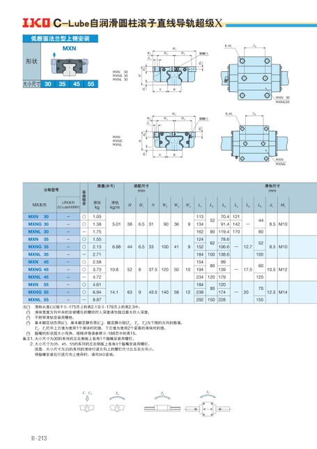 C、C0T0TXTYMXN30MXNG30MXNMXNG滑块尺寸mmW2W3W3脂嘴(5)6-M1L6H3W4d1H2HMXNMXNGMXNLNWH1质量(参考)装配尺寸mm滑块kg滑轨kg/mHH1NW2W3W4L1L2L3L4L5L6d1M11.051.381.751.552.132.712.583.734.724.616.948.875.01386.53190366.88446.533100419910.852837.5120501014.163943.514058121131341621241521841541942341842382925270.491.480119.4121142170—6278.6106.6—12.7100138.6991391791201742288012095150—17.5—208.5M108.5M1010.5M1212.5M144480521006012070150自由组合○○—○○—○○—○○—公称型号MX系列LRX系列(无C-Lube自润滑部件)MXN30MXNG30MXNLMXN3035MXNG35MXNLMXN3545MXNG45MXNLMXN4555MXNG55MXNL55————————————C-Lube自润滑圆柱滚子直线导轨超级X6-M1L6H3W2W3W3脂嘴(5)W4d1NWH1H2H30MXNMXNG30MXNL30低断面法兰型上侧安装MXN形状大小尺寸30354555注(1)(2)(3)(4)滑轨长度L记载于Ⅱ-175页上的表2.1及Ⅱ-176页上的表2.3中。滑块宽度方向中央的安装螺孔的螺纹拧入深度请勿超过最大拧入深度。不附带滑轨安装用螺栓。基本额定动负荷(C)、基本额定静负荷(C0)、额定静力矩(T0、TX、TY)为下图的方向的数值。TX、TY栏中上方值为使用1个滑块时的值,下方值为使用2个紧靠的滑块时的值。脂嘴的形状因大小而异。规格详情请参照Ⅱ-188页中的表15。(5)备注1.大小尺寸为30的系列的左右侧板上各有1个脂嘴安装用螺钉。2.大小尺寸为35、45、55的系列的左右侧板上各有3个脂嘴安装用螺钉。但是,大小尺寸为35的系列的滑块行进方向上的螺钉尺寸比左右方向小。将脂嘴安装在行进方向上使用时,请向IKO咨询。Ⅱ-213