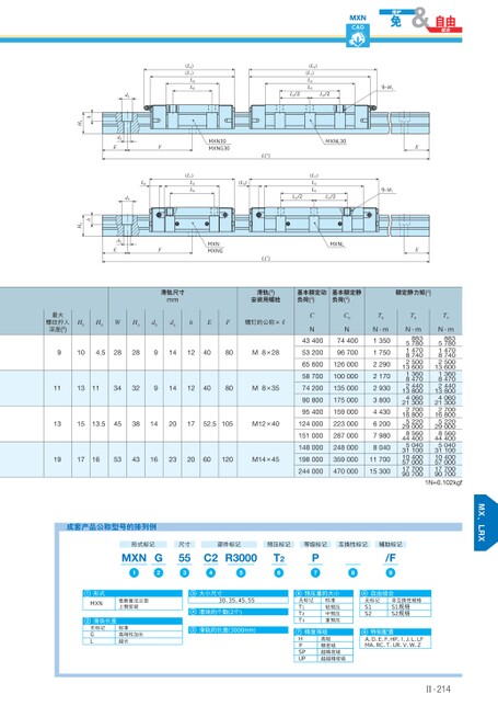 MXNCAD滑轨尺寸mm滑轨(3)安装用螺栓基本额定动负荷(4)基本额定静负荷(4)额定静力矩(4)9-M19-M1EE(L4)(L1)L3L2L2/2L2/2MXN30MXNG30MXNL30(L5)L(1)L(1)MXNMXNG(L1)L3L2L2/2L2/2MXNL(L4)(L1)L3L2(L1)L3L2d4L5d4d3Ed3EFFhH4hH4最大螺纹拧入深度(2)H2H3WH4d3d4hEF螺钉的公称×R9104.52828914124080M8×281113113432914124080M8×35CN43400532006560058700742009080095400C0N7440096700126000100000135000175000159000131513.5453814201752.5105M12×40124000223000191716534316232060120M14×45198000359000244000470000151000287000148000248000T0N·m13501750229021702930380044306200798080401170015300TXTYN·m8835780147087402500136001360847024401380040602130027001680052202900085604440050403110010400570001770090700N·m88357801470874025001360013608470244013800406021300270016800522029000856044400504031100104005700017700907001N≈0.102kgf成套产品公称型号的排列例形式标记MXN1G2尺寸553部件标记预压标记等级标记互换性标记辅助标记C2R300045T26P7/F981形式MXN低断面法兰型上侧安装2滑块长度无标记GL标准高刚性加长超长3大小尺寸30、35、45、554滑块的个数(2个)5滑轨的长度(3000mm)6预压量的大小8自由组合无标记T1T2T3标准轻预压中预压重预压精度等级7HPSPUP高级精密级超精密级超超精密级无标记S1S2非互换性规格S1规格S2规格特别配置9A、D、E、F、HP、Ⅰ、J、L、LFMA、RC、T、UR、V、W、ZⅡ-214