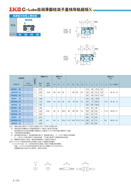 C、C0T0TXTYC-Lube自润滑圆柱滚子直线导轨超级XH3W2W4W3W3脂嘴(5)NWH1MXNSMXNSGMXNSL303030HH3(W1)W2W4W3W3脂嘴(5)NWH1MXNSMXNSGMXNSLH低断面方块型上侧安装MXNS形状大小尺寸30354555质量(参考)装配尺寸mm滑块尺寸mm滑块kg滑轨kg/mHH1NW1W2W3W4L1L2L3L4L5M1×深度(2)0.700.901.141.081.421.811.842.583.293.314.836.285.01386.516—6020106.88446.5187870251010.852820.59486301314.163923.511010037.512.5113134162124152184154194234184238292406080507270.412191.4142—M8×8119.417078.6106.6—12.7M8×9100138.66080991391201797595120174150228—17.5M10×11—20M12×15自由组合○○—○○—○○—○○—公称型号MX系列LRX系列(无C-Lube自润滑部件)MXNS30MXNSG30MXNSLMXNS3035MXNSG35MXNSLMXNS3545MXNSG45MXNSLMXNS4555MXNSG55MXNSL55————————————注(1)(2)(3)(4)滑轨长度L记载于Ⅱ-175页上的表2.1及Ⅱ-176页上的表2.3中。滑块安装孔的螺纹拧入深度推荐使用Ⅱ-190页上表16.2中的值。滑块宽度方向中央的安装螺钉的螺纹拧入深度应小于尺寸表中的最大螺纹拧入深度。不附带滑轨安装用螺栓。基本额定动负荷(C)、基本额定静负荷(C0)、额定静力矩(T0、TX、TY)为下图的方向的数值。TX、TY栏中上方值为使用1个滑块时的值,下方值为使用2个紧靠的滑块时的值。脂嘴的形状因大小而异。规格详情请参照Ⅱ-188页中的表15。(5)备注1.大小尺寸为30的系列的左右侧板上各有1个脂嘴安装用螺钉。2.大小尺寸为35、45、55的系列的左右侧板上各有3个脂嘴安装用螺钉。但是,大小尺寸为35的系列的滑块行进方向上的螺钉尺寸比左右方向小。将脂嘴安装在行进方向上使用时,请向IKO咨询。Ⅱ-215