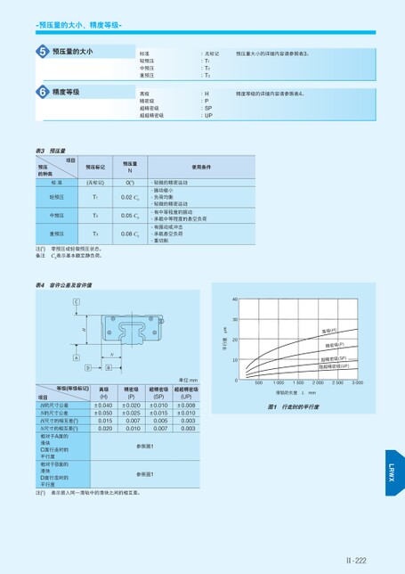 Ⅱ-222高级(H)精密级(P)超精密级(SP)超超精密级(UP)50010001500200025003000滑轨的长度Lmm图1行走时的平行度403020100平行度µm表3预压量项目预压的种类标准轻预压中预压重预压预压标记(无标记)T1T2T3预压量N0(1)0.02C00.05C00.08C0使用条件·轻微的精密运动·振动极小·负荷均衡·轻微的精密运动·有中等程度的振动·承载中等程度的悬空负荷·有振动或冲击·承载悬空负荷·重切削注(1)备注零预压或轻微预压状态。C0表示基本额定静负荷。表4容许公差及容许值CAHDNB等级(等级标记)项目H的尺寸公差N的尺寸公差H尺寸的相互差(1)N尺寸的相互差(1)相对于A面的滑块C面行走时的平行度相对于B面的滑块D面行走时的平行度单位mm高级(H)±0.040±0.0500.0150.020精密级超精密级超超精密级(P)±0.020±0.0250.0070.010(SP)±0.010±0.0150.0050.007(UP)±0.008±0.0100.0030.003参照图1参照图1注(1)表示装入同一滑轨中的滑块之间的相互差。-预压量的大小、精度等级-56预压量的大小精度等级标准轻预压中预压重预压高级精密级超精密级超超精密级:无标记:T1:T2:T3:H:P:SP:UP预压量大小的详细内容请参照表3。精度等级的详细内容请参照表4。