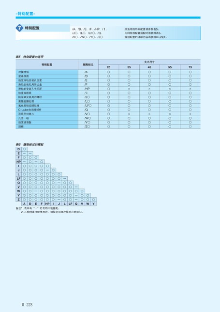-特别配置-7特别配置/A、/D、/E、/F、/HP、/1、/J○、/L○、/LF○、/Q、/V○、/W○、/Y○、/Z○所适用的特别配置请参照表5。几种特别配置搭配时请参照表6。特别配置的详细内容请参照Ⅲ-29页。25○○○○○○○○○○○○○○35○○○○×○○○○○×○○○大小尺寸45○○○○×○○○○○×○○○55○○○○×○○○○○×○○○75○○○○×○○○○○×○○○表5特别配置的适用特别配置辅助标记对接滑轨逆基准面指定滑轨安装孔位置滑轨安装孔用防尘盖滑轨的安装孔半间距检查成绩表防尘罩安装用内螺纹黑铬皮膜处理氟化黑铬皮膜处理C-Lube自润滑部件双层密封垫片几套一组指定润滑脂刮板表6辅助标记的搭配○—○—○○○○○○○○—○○○○○○○○○○○—○○○○○○—○○○○○○○○○○○—○○○○○○○○○○○○○○○—○○○—○○○○○○○○—○—○○DEFHPIJLLFQVWYZ○E○D○A—J备注1.表中有“—”符号的不能搭配。2.几种种类搭配使用时,请按字母顺序排列注明标记。○HP○L○LF—Q○V○F○I/A/D/E/F/HP/1/J○/L○/LF○/Q/V○/W○/Y○/Z○○○W○YⅡ-223