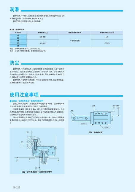 滑块安装基准面DB标记标记图4安装基准面润滑LRWX系列中封入了添加极压添加剂的锂皂基润滑脂(AlvaniaEP润滑脂2[ShellLubricantsJapanK.K.])。LRWX系列附带表10中所示的脂嘴。表10润滑用部件大小尺寸2535455575脂嘴的形式(1)JIS1型JIS2型搭配注油嘴的形式配管用内螺纹的公称市售的加脂枪M6PT1/8注(1)备注脂嘴规格请参照Ⅲ-23页中的表14.2。还备有不锈钢制脂嘴,需要时请向IKO咨询。防尘LRWX系列的滑块虽然已经标准配备了侧面密封垫片及下面密封垫片来防尘,但大量垃圾或灰尘浮游时,或者诸如切屑、沙尘等较大的异物粘附在轨道面上时,彻底防尘非常困难,因此推荐用防尘罩或大行程多段式密封件等整体覆盖的方法。LRWX系列备有专用防尘罩。专用防尘罩安装方便,防尘效果显著。需要时请参照Ⅲ-26页后再订购。使用注意事项安装面、安装基准面及一般性的安装结构安装LRWX系列时,将滑轨及滑块的安装基准面B、D正确地对准工作台及底座的安装基准面进行固定。(参照图3)安装基准面B、D及安装面A、C已经过精密的研磨精加工。所以如果安装侧的机械、装置等的安装面也经过了高精度的加工并正确安装,滑轨就能够获得稳定的高精度直线运动。滑块的安装基准面是有面是正视滑轨上表面的4)标记的相反的一侧。滑轨的安装基准标记,其上方的侧面(箭头方向)。(参照图DCB图3安装基准面及一般性的安装结构AⅡ-225