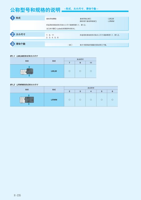 公称型号和规格的说明-形式、大小尺寸、滑块个数-1形式直线导轨模组直线导轨LM(1)圆柱滚子直线导轨M(1):LWLM:LRWM所适用的滑块的形式和大小尺寸请参照表1.1、表1.2。注(1)未内置C-Lube自润滑部件的形式。23大小尺寸滑块个数7、9、112、3、4、5、6所适用的滑块的形式和大小尺寸请参照表1.1、表1.2。:M○表示1根滑轨所搭配的滑动单元个数。表1.1LWLM的形式和大小尺寸形状形式LWLM表1.2LRWM的形式和大小尺寸形状形式LRWM大小尺寸9○3○7○2○11○大小尺寸4○5○6○Ⅱ-235