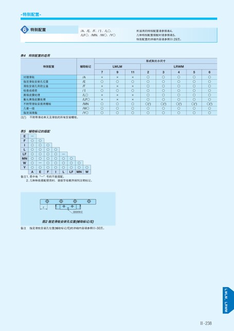 LWLM、LRWM-特别配置-6特别配置表4特别配置的适用/A、/E、/F、/1、/L○、/LF○、/MN、/W○、/Y○所适用的特别配置请参照表4。几种特别配置搭配时请参照表5。特别配置的详细内容请参照Ⅲ-29页。特别配置辅助标记LWLMLRWM形式和大小尺寸对接滑轨指定滑轨安装孔位置滑轨安装孔用防尘盖检查成绩表黑铬皮膜处理氟化黑铬皮膜处理不附带滑轨安装用螺栓几套一组指定润滑脂/A/E/F/1/L○/LF○/MN/W○/Y○7×○×○××○○○9×○×○××○○○11×○×○××○○○2○○○○○○○(1)○○3○○○○○○○(1)○○4○○○○○○○(1)○○5○○○○○○○(1)○○6○○○○○○○(1)○○注(1)不附带滑动单元及滑轨的所有安装螺栓。表5辅助标记的搭配EFILLFMNWY—○○○○○○○A○○○○○—○E○○○○○○F○○○○○I—○○○L○○○LF○○MN○W备注1.表中有“—”号的不能搭配。2.几种种类搭配使用时,请按字母顺序排列注明标记。E标记图2指定滑轨安装孔位置(辅助标记/E)备注指定滑轨安装孔位置(辅助标记/E)的详细内容请参照Ⅲ-30页。Ⅱ-238