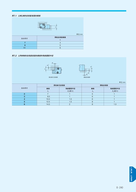 LWLM、LRWMⅡ-240大小尺寸23456滑动单元安装部滑轨安装部肩高h178.510.512.514.5角部圆弧半径R1(最大)111.51.52肩高h256688单位mm角部圆弧半径R2(最大)11111.5h2R2R2滑轨安装部滑动单元安装部R1R1h1表7.1LWLM的安装基准面的肩高h滑轨安装部肩高单位mmh456大小尺寸7911表7.2LRWM的安装基准面的肩高和角部圆弧半径