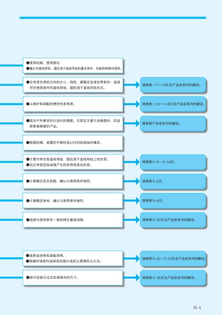 ●使用机械、使用部位●确认对直线导轨、圆柱滚子直线导轨的要求条件、性能和特殊环境等。●应考虑负荷的方向的大小、刚性、摩擦及安装性等条件,选择符合使用条件的直线导轨、圆柱滚子直线导轨形式。请参照Ⅰ-7~Ⅰ-8页及产品各系列的解说。●从维护和装配的便利性来考虑。请参照Ⅰ-15~Ⅰ-18页及产品各系列的解说。●取决于所要求的行走时的精度。尤其在注重行走精度时,应选择更高精度的产品。请参照产品各系列的解说。●根据机械、装置的平衡性或以往的经验临时确定。●计算作用在各直线导轨、圆柱滚子直线导轨上的负荷。●还应考虑因加减速产生的负荷或变动负荷。请参照Ⅲ-9~Ⅲ-18页。●计算静态安全系数,确认与使用条件相符。请参照Ⅲ-6页。●计算额定寿命,确认与使用条件相符。请参照Ⅲ-6页。●选择与使用条件一致的预压量或间隙。请参照Ⅲ-20页及产品各系列的解说。●选择油润滑或油脂润滑。●根据环境条件选择密封垫片或防尘罩等防尘方法。请参照Ⅲ-21~Ⅲ-27页及产品各系列的解说。●探讨安装方法及安装相关的尺寸。请参照Ⅲ-36页及产品各系列的解说。Ⅲ-4