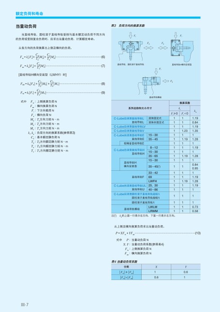 (6)(7)(8)(9)直线导轨、圆柱滚子直线导轨直线导轨H横向安装型FrFa直线导轨模组换算系数系列名称和大小尺寸krFr≥0C-Lube自润滑直线导轨L直线导轨LC-Lube自润滑直线导轨LVC-Lube自润滑直线导轨VC-Lube自润滑直线导轨E直线导轨E低噪音直线导轨EC-Lube自润滑直线导轨H直线导轨H直线导轨H横向安装型直线导轨FC-Lube自润滑直线导轨UL直线导轨U滚珠固定式滚珠非固定式15~3035~458~1215~3035~6515~3035~45(1)33~4269LWFH25、3040~86C-Lube自润滑圆柱滚子直线导轨超级X圆柱滚子直线导轨超级X圆柱滚子直线导轨X直线导轨模组LWLMLRWM111111111111111111111Fr<01111.2311.191111.1911111.19111111ka1.190.841.191.3511.2811.1911.2810.840.9511.191.281.191110.730.58注(1)ka的上面一行表示右方向,下面一行表示左方向。从上侧及横向换算负荷求出当量动负荷。P=XFre+YFae(10)式中P:当量动负荷NX、Y:当量动负荷系数(参照表4)Fre:上侧换算负荷NFae:横向换算负荷N4当量动负荷系数表Fre=krFr+M0+C0—TXMXFae=kaFa+MYC0—T0C0—TY[直线导轨H横向安装型(LWHY)时]Fae=kaFa+M0+C0—T0C0—TXMxFre=krFr+C0—TYMY式中Fre:上侧换算负荷NFae:横向换算负荷NFr:下方向载荷NFa:横向负荷NM0:T0方向力矩N·mMX:TX方向力矩N·mMY:TY方向力矩N·mkr、ka:负荷方向的换算系数(参照表3)C0:基本额定静负荷NT0:T0方向额定静力矩N·mTX:TX方向额定静力矩N·mTY:TY方向额定静力矩N·m分类Fre≥FaeFre<FaeX10.6Y0.61Ⅲ-7额定负荷和寿命当量动负荷表3负荷方向的换算系数当直线导轨、圆柱滚子直线导轨受到与基本额定动负荷不同方向的负荷或受到复合负荷时,应求出当量动负荷,计算额定寿命。从各方向的负荷换算出上侧及横向的负荷。FrFrFaFa