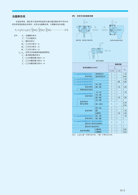 当量静负荷当直线导轨、圆柱滚子直线导轨受到与基本额定静负荷不同方向的负荷或受到复合负荷时,应求出当量静负荷,计算静态安全系数。P0=k0rFr+k0aFa+C0—T0M0+C0—TXMX+C0—TYMY(11)表5负荷方向的换算系数FrFrFaFa式中P0:当量静负荷NFr:下方向载荷NFa:横向负荷NM0:T0方向力矩N·mMX:TX方向力矩N·mMY:TY方向力矩N·mk0r、k0a:负荷方向的换算系数(参照表5)C0:基本额定静负荷NT0:T0方向额定静力矩N·mTX:TX方向额定静力矩N·mTY:TY方向额定静力矩N·m直线导轨、圆柱滚子直线导轨直线导轨H横向安装型FrFa直线导轨模组换算系数系列名称和大小尺寸k0rFr≥0C-Lube自润滑直线导轨L直线导轨LC-Lube自润滑直线导轨LVC-Lube自润滑直线导轨VC-Lube自润滑直线导轨E直线导轨E低噪音直线导轨EC-Lube自润滑直线导轨H直线导轨H直线导轨H横向安装型直线导轨FC-Lube自润滑直线导轨UL直线导轨U滚珠固定式滚珠非固定式15~3035~458~1215~3035~6515~3035~45(1)33~4269LWFH25、3040~86C-Lube自润滑圆柱滚子直线导轨超级X圆柱滚子直线导轨超级X圆柱滚子直线导轨X直线导轨模组LWLMLRWM111111111111111111111注(1)k0a的上面一行表示右方向,下面一行表示左方向。Fr<01111.8811.191111.1911111.19111111k0a1.190.841.192.0811.2811.1911.2810.780.9311.191.281.191110.600.50Ⅲ-8