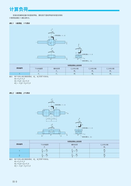 计算负荷安装在机械和设备中的直线导轨、圆柱滚子直线导轨所承受负荷的计算例如表6.1-表6.6所示。表6.11根滑轨、1个滑块负荷位置(X、Y、Z)FYYMyZMpFX100XXZMrFZFY负荷位置(X、Y、Z)0Y驱动位置(Yd、Zd)作用在滑块上的负荷T0方向力矩M0MrTX方向力矩MXMpTY方向力矩MYMy滑块编号1下方向载荷横向负荷FrFzFaFY备注各个方向上的力矩负荷Mr、Mp、My可用下式求出。Mr=FYZ+FZYMp=FX(Z-Zd)+FZXMy=-FX(Y-Yd)+FYX表6.21根滑轨、2个滑块YMy负荷位置(X、Y、Z)Fx02FY1XR/2/2RRZMp201XZMrFZFY负荷位置(X、Y、Z)0Y驱动位置(Yd、Zd)作用在滑块上的负荷横向负荷Fa+-FY—2FY—2My—rMy—rT0方向力矩M0Mr—2Mr—2滑块编号12下方向载荷Fr+-Mp—rMp—rFz—2Fz—2备注各个方向上的力矩负荷Mr、Mp、My可用下式求出。Mr=FYZ+FZYMp=FX(Z+Zd)+FZXMy=-FX(Y-Yd)+FYXⅢ-9