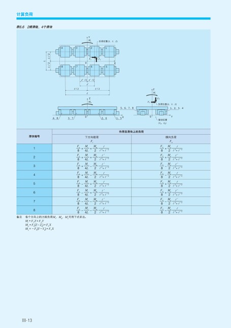 R/2′/2R′/2RR/2R′RZMpZMrFZ5、6、7、8FY负荷位置(X、Y、Z)1、2、3、44、83、702、6X1、50Y驱动位置(Yd、Zd)r2+r′2—r2FaMy—r′2+r′2—rr′2+r′2—rr2+r′2—rr2+r′2—rr′2+r′2—rr′2+r′2—rr2+r′2—rMy—2My—2My—2My—2My—2My—2My—2FY—8FY—8FY—8FY—8FY—8FY—8FY—8FY—8++--++--作用在滑块上的负荷横向负荷滑块编号下方向载荷Frr2+r′2—rr′2+r′2—rr′2+r′2—rr2+r′2—rr2+r′2—rr′2+r′2—rr′2+r′2—rr2+r′2—r12345678Fz—8Fz—8Fz—8Fz—8Fz—8Fz—8Fz—8Fz—8++++----Mr—4LMr—4LMr—4LMr—4LMr—4LMr—4LMr—4LMr—4L++--++--Mp—2Mp—2Mp—2Mp—2Mp—2Mp—2Mp—2Mp—2备注各个方向上的力矩负荷Mr、Mp、My可用下式求出。Mr=FYZ+FZYMp=FX(Z-Zd)+FZXMy=-FX(Y-Yd)+FYXⅢ-13负荷位置(X、Y、Z)15XyYM2FxFY064837L/2L/2L计算负荷表6.62根滑轨、4个滑块