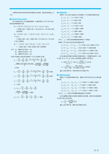 计算例1的条件时的寿命时间和静态安全系数。假设负荷系数fW为1.5。计算额定寿命按照Ⅲ-7页上的公式(6)及公式(7)换算上下方向载荷及横向负荷。Fre1=kr│Fr1│=1×1750=1750Fre2=kr│Fr2│=1×346=346Fre3=kr│Fr3│=1×252=252Fre4=kr│Fr4│=1×1150=1150Fae1=ka│Fa1│=1×1600=1600Fae2=ka│Fa2│=1×600=600Fae3=ka│Fa3│=1×1600=1600Fae4=ka│Fa4│=1×600=600式中kr、ka:负荷方向的换算系数(参照Ⅲ-7页表3)按照Ⅲ-7页上的公式(10)计算当量动负荷。P1=X│Fre1│+Y│Fae1│=1×1750+0.6×1600=2710P2=X│Fre2│+Y│Fae2│=0.6×346+1×600≈808P3=X│Fre3│+Y│Fae3│=0.6×252+1×1600≈1750P4=X│Fre4│+Y│Fae4│=1×1150+0.6×600=1510求出当量动负荷最大的滑块1的额定寿命。计算额定寿命时,应在Ⅲ-6页的公式(1)中加入负荷系数fw(参照Ⅲ-6页表1)。Lh1=106L1—2Sn1×60=106×4410—2×100×5×60≈73500通过上述计算可知,寿命时间约为73500小时。计算静态安全系数根据上下方向载荷及横向负荷,按照Ⅲ-8页中的公式(11)计算当量静负荷。P01=k0r│Fr1│+k0a│Fa1│=1×1750+1×1600=3350P02=k0r│Fr2│+k0a│Fa2│=1×346+1×600=946P03=k0r│Fr3│+k0a│Fa3│=1×252+1×1600=1852P04=k0r│Fr4│+k0a│Fa4│=1×1150+1×600=1750式中k0r、k0a:负荷方向的换算系数(参照Ⅲ-8页表5)求出当量静负荷最大的滑块1的静态安全系数。静态安全系数按照Ⅲ-6页中的公式(4)计算。21100—3350C0—P01fs1==≈6.3通过上述计算可知,静态安全系数约为6.3。Ⅲ-16)3≈441018100.5×2710—1)3=50×(C—fWP1L1=50(计算作用于滑块上的负荷由于负载负荷及工作台质量的影响,在直线导轨上产生了如下所示的各坐标轴周围的力矩。Mr=Σ(FYZ)+Σ(FZY)=FY1Z1+FZ1Y1+m1gY2+m2gY3=2000×83+1000×50+10×9.8×0+10×9.8×80≈224000Mp=Σ{FX(Z-Zd)}+Σ(FZS)=FX1(Z1-Zd)+FZ1X1+m1gX2+m2gX3×75≈140000=1000×(83-10)+1000×60+10×9.8×0+10×9.8My=-Σ{FX(Y-Yd)}+Σ(FYX)=-FX1(Y1-Yd)+FY1X1=-1000×(50-150)+2000×60=220000式中Mr:偏转方向力矩N·mmMp:俯仰方向力矩N·mmMy:摇摆方向力矩N·mm作用于各滑块上的负荷可按照Ⅲ-11页上的表6.4计算。Fr1=ΣFZ—4+Mr—2L+Mp—2r=FZ1+m1g+m2g—4+Mr—2L+Mp—2r=1000+10×9.8+10×9.8——4+224000—2×150+140000—2×100≈1750Fr2=Fr3=ΣFZ—4ΣFZ—4+--Mr—2LMr—2L+Mp—2rMp—2r==FZ1+m1g+m2g—4FZ1+m1g+m2g—4+--Mr—2LMr—2L+Mp—2rMp—2r≈346≈252Fr4=ΣFZ—4-Mr—2L-Mp—2r=≈-1150FZ1+m1g+m2g—4-Mr—2L-Mp—2rFa1=Fa3==2000—4+=+My—2rΣFY—4FY1—4+220000—2×100=1600ΣFY—4FY1—4My—2r-=-My—2rMy—2r=-600Fa2=Fa4=