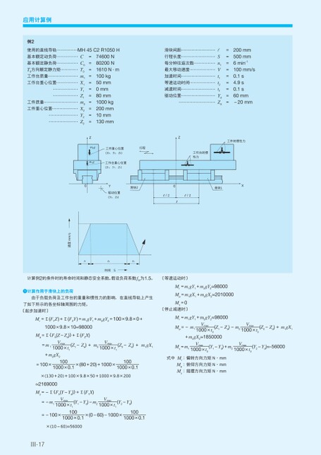 应用计算例例2使用的直线导轨基本额定动负荷基本额定静负荷T0方向额定静力矩工作台质量工作台重心位置工件质量工件重心位置MH45C2R1050HCC0T0m1X1Y1Z1m2X2Y2Z2===========74600N80200N1610N·m100kg50mm0mm80mm1000kg200mm10mm130mm滑块间距行程长度每分钟往返次数最大移动速度加速时间等速运动时间减速时间驱动位置rSn1Vt1t2t3YdZd=========200mm500mm6min-1100mm/s0.1s4.9s0.1s60mm-20mmZm2gm1g行程工件重心位置(X2、Y2、Z2)工作台重心位置(X1、Y1、Z1)Z工件的惯性力工作台的惯性力0Y驱动位置(Yd、Zd)滑块20滑块1XR/2R/2R计算例2的条件时的寿命时间和静态安全系数。假设负荷系数fW为1.5。〔等速运动时〕t1t2t3时间S速度mm/s计算作用于滑块上的负荷由于负载负荷及工作台的重量和惯性力的影响,在直线导轨上产生了如下所示的各坐标轴周围的力矩。〔起步加速时〕Mr=Σ(FYZ)+Σ(FZY)=m1gY1+m2gY2=100×9.8×0+1000×9.8×10≈98000Mp=Σ{FX(Z-Zd)}+Σ(FZX)=m1Vmax—1000×t1+m2gX2(Z1-Zd)+m2Vmax—1000×t1(Z2-Zd)+m1gX1=100×100—1000×0.1×(80+20)+1000×100—1000×0.1×(130+20)+100×9.8×50+1000×9.8×200≈2169000My=-Σ{FX(Y-Yd)}+Σ(FYX)=-m1Vmax—1000×t1(Y1-Yd)-m2Vmax—1000×t1(Y2-Yd)Mr=m1gY1+m2gY2≈98000Mp=m1gX1+m2gX2≈2010000My=0〔停止减速时〕Mr=m1gY1+m2gY2≈98000Mp=-m1Vmax—1000×t3(Z1-Zd)-m2Vmax—1000×t3(Z2-Zd)+m1gX1+m2gX2≈1850000My=m1Vmax—1000×t3(Y1-Yd)+m2Vmax—1000×t3(Y2-Yd)≈-56000式中Mr:偏转方向力矩N·mmMp:俯仰方向力矩N·mmMy:摇摆方向力矩N·mm=-100×100—1000×0.1×(0-60)-1000×100—1000×0.1×(10-60)≈56000Ⅲ-17