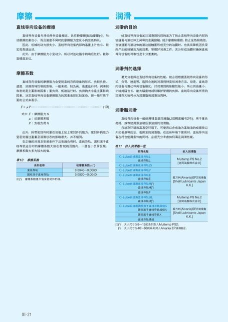 摩擦直线导向设备的摩擦润滑润滑的目的直线导向设备与滑动导向设备相比,具有静摩擦(起动摩擦)小,与给直线导向设备加注润滑剂的目的是为了防止直线导向设备内部的动摩擦的差也小,而且速度不同时的摩擦阻力变化小的出色特长。轨道面与滚动体之间等的金属接触,减少摩擦和磨损,防止发热和烧结。因此,机械的动力损失少,直线导向设备内部的温度上升也小,能当轨道面与滚动体的滚动接触面形成充分的油膜时,也具有降低因负荷实现高速运动。而产生的接触应力的效果。管理好润滑工作,充分形成油膜对确保直线此外,由于摩擦阻力小变动少,所以对运动指令的响应性好,能够导向设备的可靠性是十分重要的。高精度定位。摩擦系数润滑剂的选择要充分发挥出直线导向设备的性能,就必须根据直线导向设备的形直线导向设备的摩擦阻力会受到直线导向设备的形式、负载负荷、式、负荷、速度等,选择合适的润滑剂种类和润滑方法。但是,直线导速度、润滑剂特性等的影响。一般来说,轻负荷、高速运行时,润滑剂向设备与滑动导向设备相比,对润滑剂的依赖性极小,所以供油量小,和密封是主要影响因素;重负荷、低速运行时,负荷的大小是主要影响补给间隔也长,能大幅度地减轻维护管理的负担。直线导向设备所用的因素。决定直线导向设备摩擦阻力的因素虽然比较复杂,但一般可用下润滑剂大致可分为润滑脂和润滑油两种。面的公式来表示。F=μP式中F:摩擦阻力Nμ:动摩擦系数P:负载负荷N(13)润滑脂润滑直线导向设备一般使用锂皂基润滑脂(JIS稠度编号2号),用于重负荷时,推荐使用添加极压添加剂的润滑脂。在洁净环境和高真空环境下,可使用以合成油为基础油的或锂类以此外,附带密封件时要在该值上加上密封件的阻力,密封件的阻力外的皂基等低尘、低挥发的润滑脂。在这些环境下使用时,直线导向设受密封唇过盈量及润滑状态的影响很大,并不相同。备在符合使用条件的同时,必须充分考虑如何满足润滑性能。在正确的润滑及安装条件下且普通负荷时,直线导轨、圆柱滚子直线导轨运行时的摩擦系数大致在表10的范围内。一般在小负荷区域,摩擦系数大多为较大的值。表11封入润滑脂一览系列名称封入润滑脂表10摩擦系数系列名称直线导轨圆柱滚子直线导轨注(1)摩擦系数是不包含密封件的值。动摩擦系数μ(1)0.0040~0.00600.0020~0.0040C-Lube自润滑直线导轨L直线导轨LC-Lube自润滑直线导轨LVC-Lube自润滑直线导轨VC-Lube自润滑直线导轨E直线导轨EC-Lube自润滑直线导轨H(1)直线导轨H(1)直线导轨FC-Lube自润滑直线导轨UL直线导轨U(2)C-Lube自润滑圆柱滚子直线导轨超级X圆柱滚子直线导轨超级X圆柱滚子直线导轨X直线导轨模组MultempPSNo.2[协同油脂株式会社]爱万利(Alvania)EP2润滑脂[ShellLubricantsJapanK.K.]MultempPSNo.2[协同油脂株式会社]爱万利(Alvania)EP2润滑脂[ShellLubricantsJapanK.K.]注(1)(2)大小尺寸为8~12的系列封入MultempPS2。大小尺寸为40~86的系列封入AlvaniaEP润滑脂2。Ⅲ-21