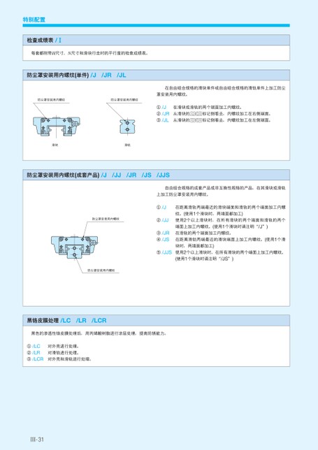特别配置检查成绩表/Ⅰ每套都附带H尺寸、N尺寸和滑块行走时的平行度的检查成绩表。防尘罩安装用内螺纹(单件)/J/JR/JL在自由组合规格的滑块单件或自由组合规格的滑轨单件上加工防尘罩安装用内螺纹。在滑块或滑轨的两个端面加工内螺纹。从滑块的从滑块的标记侧看去,内螺纹加工在右侧端面。标记侧看去,内螺纹加工在左侧端面。防尘罩安装用内螺纹防尘罩安装用内螺纹①/J②/JR③/JL滑块滑轨防尘罩安装用内螺纹(成套产品)/J/JJ/JR/JS/JJS自由组合规格的成套产品或非互换性规格的产品,在其滑块或滑轨上加工防尘罩安装用内螺纹。①/J②/JJ③/JR④/JS⑤/JJS在距离滑轨两端最近的滑块端面和滑轨的两个端面加工内螺纹。(使用1个滑块时,两端面都加工)使用2个以上滑块时,在所有滑块的两个端面和滑轨的两个端面上加工内螺纹。(使用1个滑块时请注明“/J”)在滑轨的两个端面加工内螺纹。在距离滑轨两端最近的滑块端面上加工内螺纹。(使用1个滑块时,两端面都加工)使用2个以上滑块时,在所有滑块的两个端面上加工内螺纹。(使用1个滑块时请注明“/JS”)防尘罩安装用内螺纹防尘罩安装用内螺纹黑铬皮膜处理/LC/LR/LCR黑色的渗透性铬皮膜处理后,用丙烯酸树脂进行涂层处理,提高防锈能力。①/LC②/LR③/LCR对外壳进行处理。对滑轨进行处理。对外壳和滑轨进行处理。Ⅲ-31