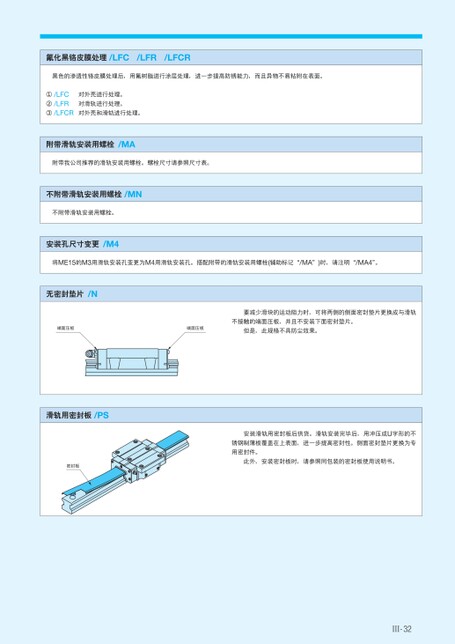 氟化黑铬皮膜处理/LFC/LFR/LFCR黑色的渗透性铬皮膜处理后,用氟树脂进行涂层处理,进一步提高防锈能力,而且异物不易粘附在表面。对外壳进行处理。①/LFC②/LFR③/LFCR对外壳和滑轨进行处理。对滑轨进行处理。附带滑轨安装用螺栓/MA附带我公司推荐的滑轨安装用螺栓。螺栓尺寸请参照尺寸表。不附带滑轨安装用螺栓/MN不附带滑轨安装用螺栓。安装孔尺寸变更/M4将ME15的M3用滑轨安装孔变更为M4用滑轨安装孔。搭配附带的滑轨安装用螺栓(辅助标记“/MA”)时,请注明“/MA4”。无密封垫片/N端面压板端面压板要减少滑块的运动阻力时,可将两侧的侧面密封垫片更换成与滑轨不接触的端面压板,并且不安装下面密封垫片。但是,此规格不具防尘效果。滑轨用密封板/PS密封板安装滑轨用密封板后供货。滑轨安装完毕后,用冲压成U字形的不锈钢制薄板覆盖在上表面,进一步提高密封性。侧面密封垫片更换为专用密封件。此外,安装密封板时,请参照同包装的密封板使用说明书。Ⅲ-32